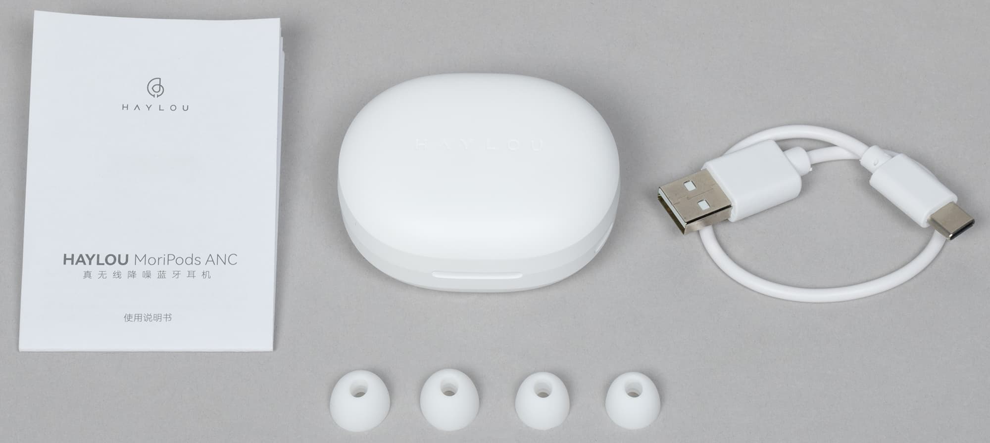 Помимо самих наушников в комплект входят две пары сменных силиконовых насадок, инструкция и кабель для зарядки USB-A—USB-С длиной 20 см.