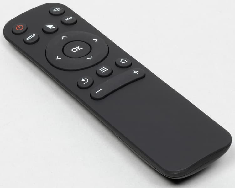 Прилагаемый к плееру инфракрасный пульт ДУ имеет матовое покрытие софт-тач, миниатюрные габариты и почти ничего не весит. Какая-либо маркировка на его корпусе отсутствует. Кнопки с таким же покрытием легко нажимаются и дают четкий тактильный отклик с мягким щелчком. Подсветки в пульте нет.