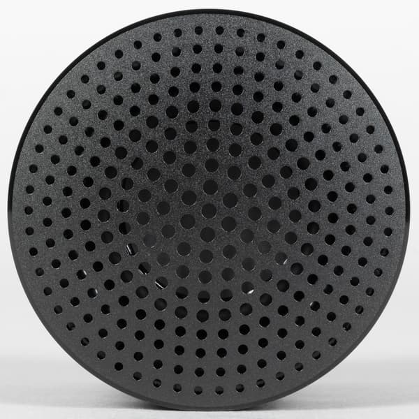 Верхняя часть корпуса отверстиями разного диаметра с концентрическим расположением, за которой виднеется динамик диаметром 43 мм.