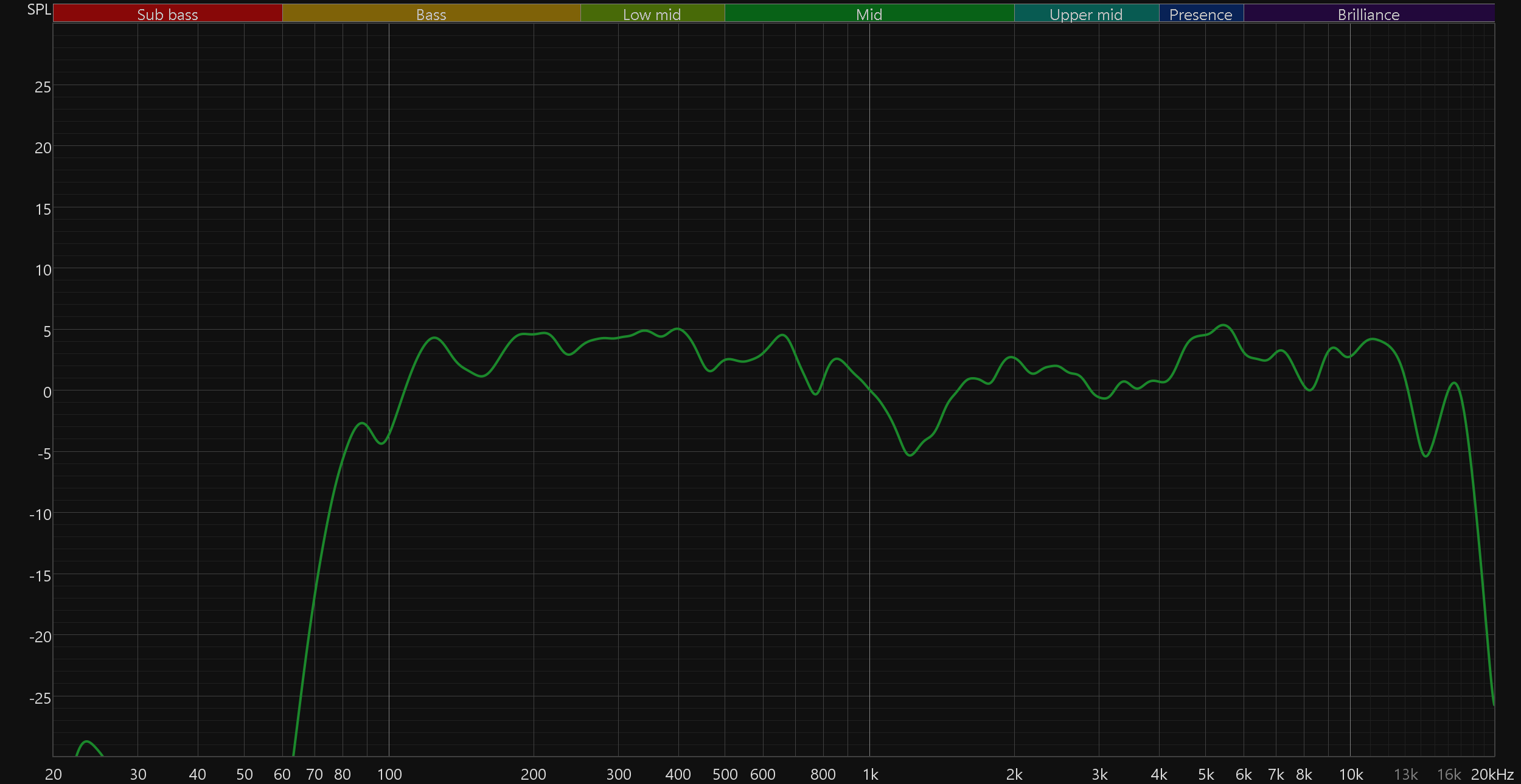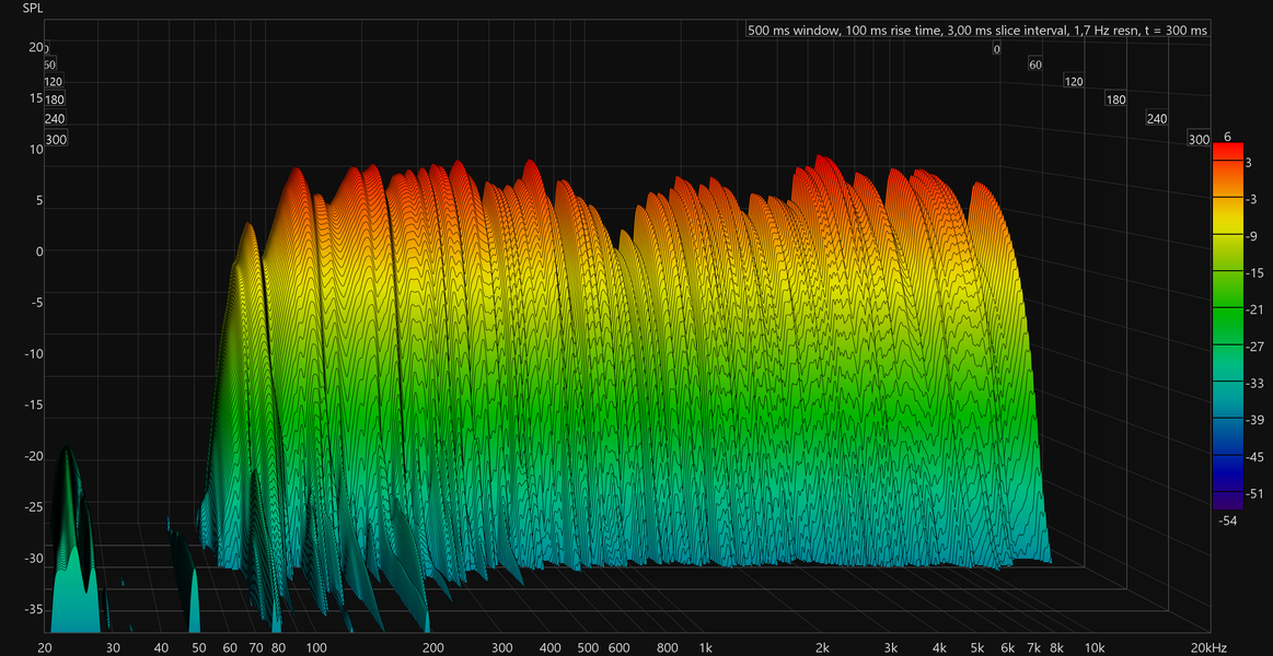 Бас на удивление плотный, что хорошо видно на графике кумулятивного затухания спектра (он же «водопад» или waterfall). Пики в НЧ вызваны вибрацией корпуса, которые неизбежны при столь малой массе акустики в сочетании с направленным вниз басовым излучателем.