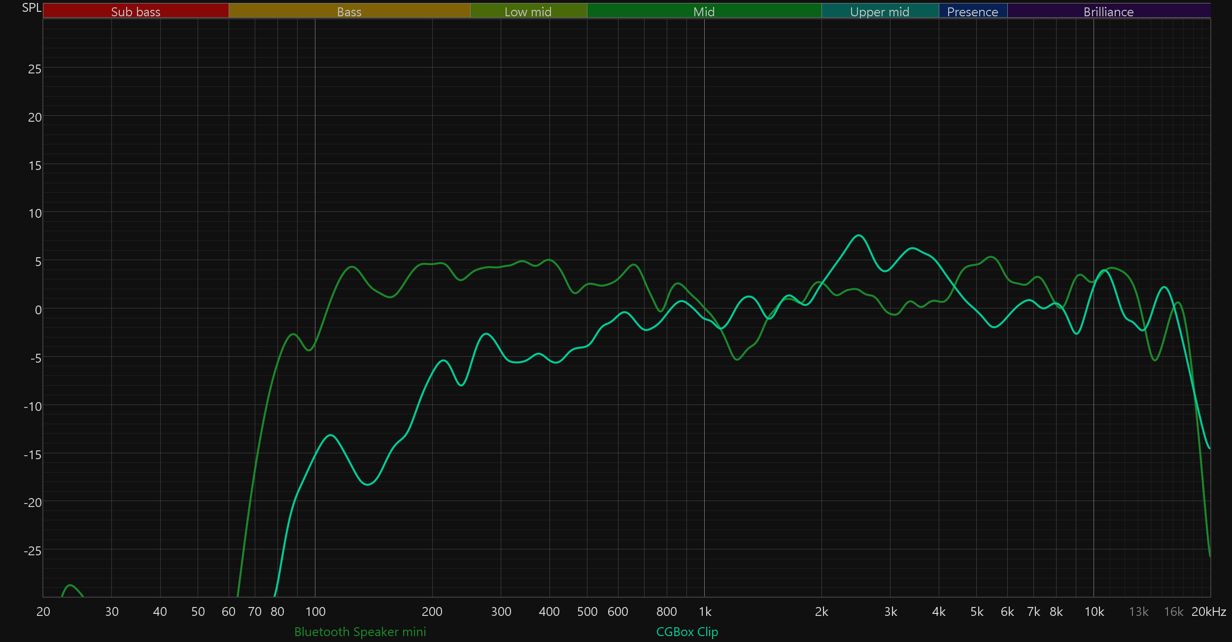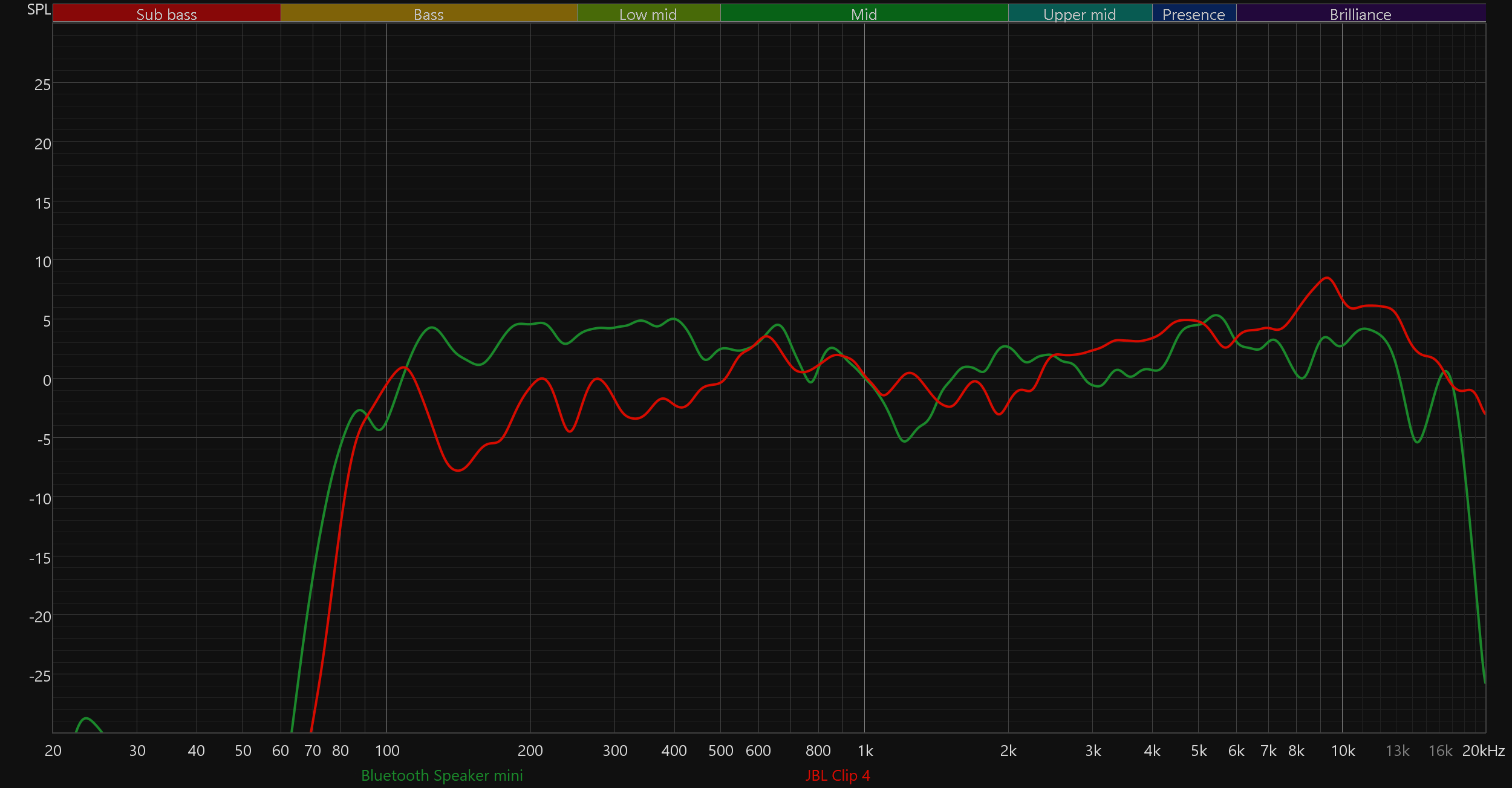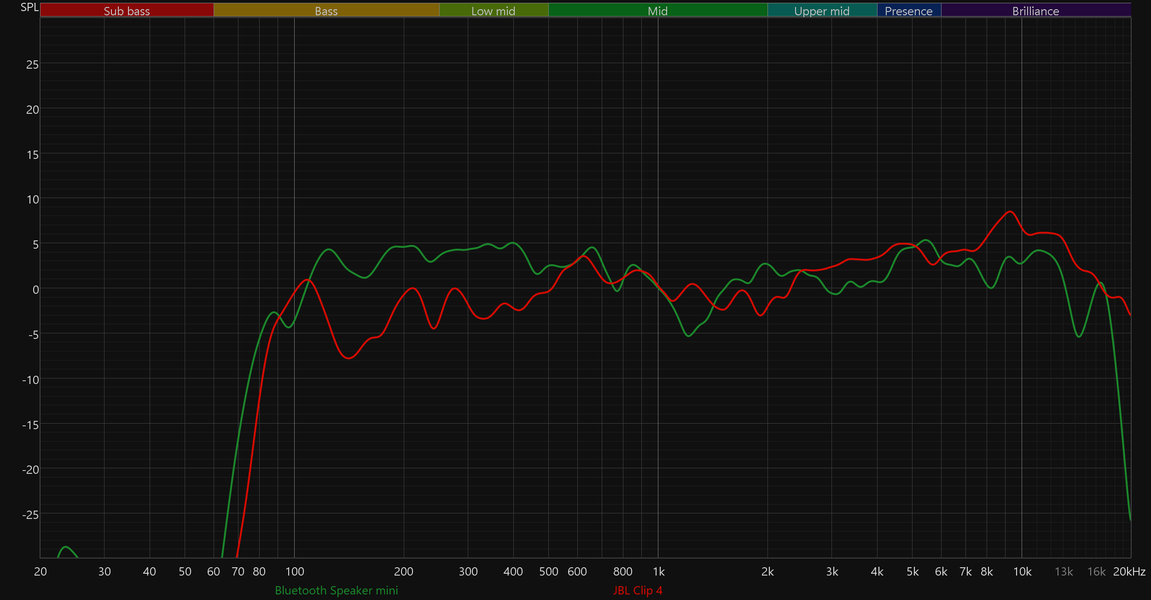 Сравним звучание двух ультрапортативных колонок — уже упомянутой во введении широко известной JBL Clip 4 и героини сегодняшнего обзора. В области НЧ Honor Choice Bluetooth Speaker mini показывает гораздо более интересные результаты, чем знаменитая соперница — опять-таки сказывается наличие пассивного излучателя. При этом весит она даже поменьше, а размеры вполне сопоставимы.