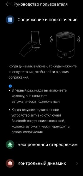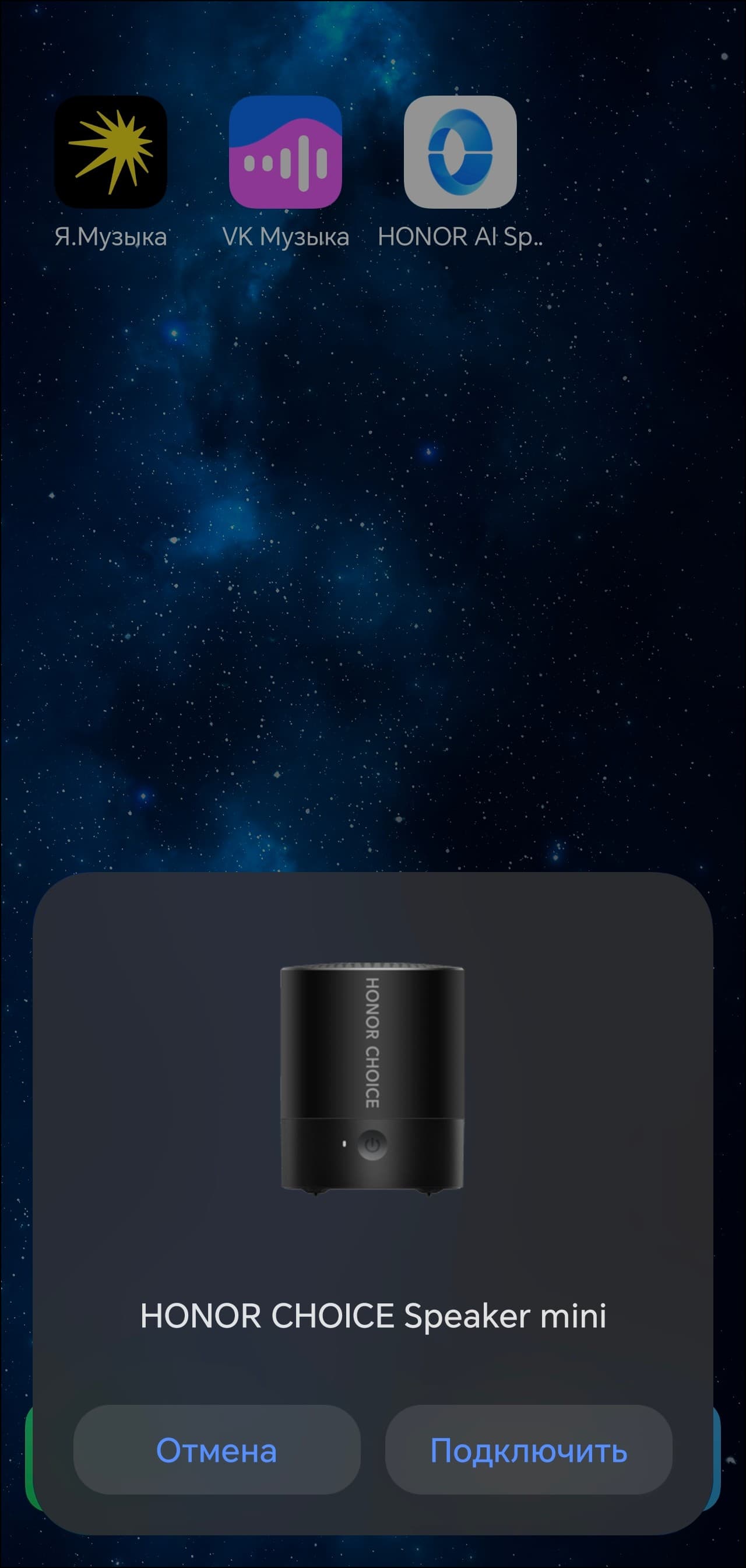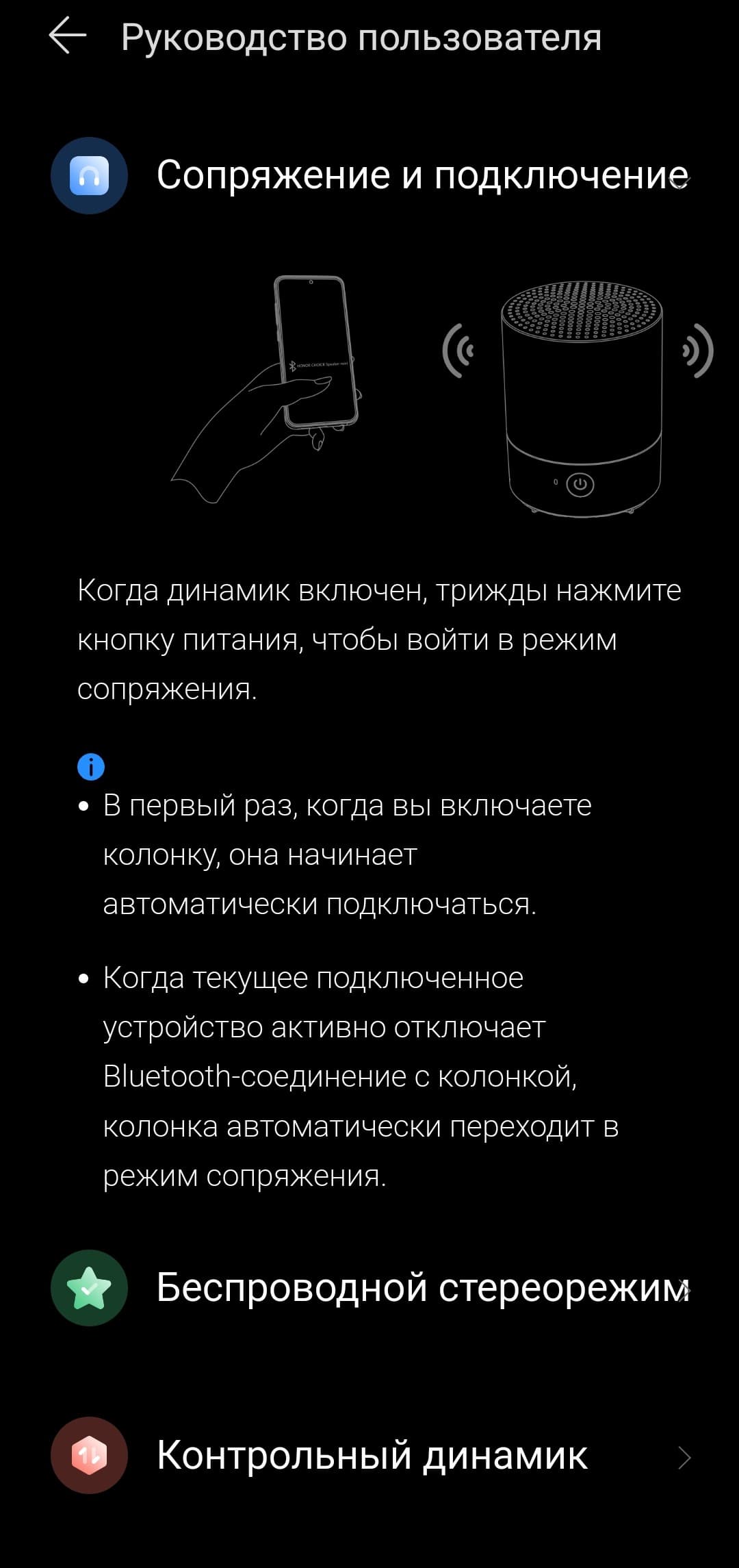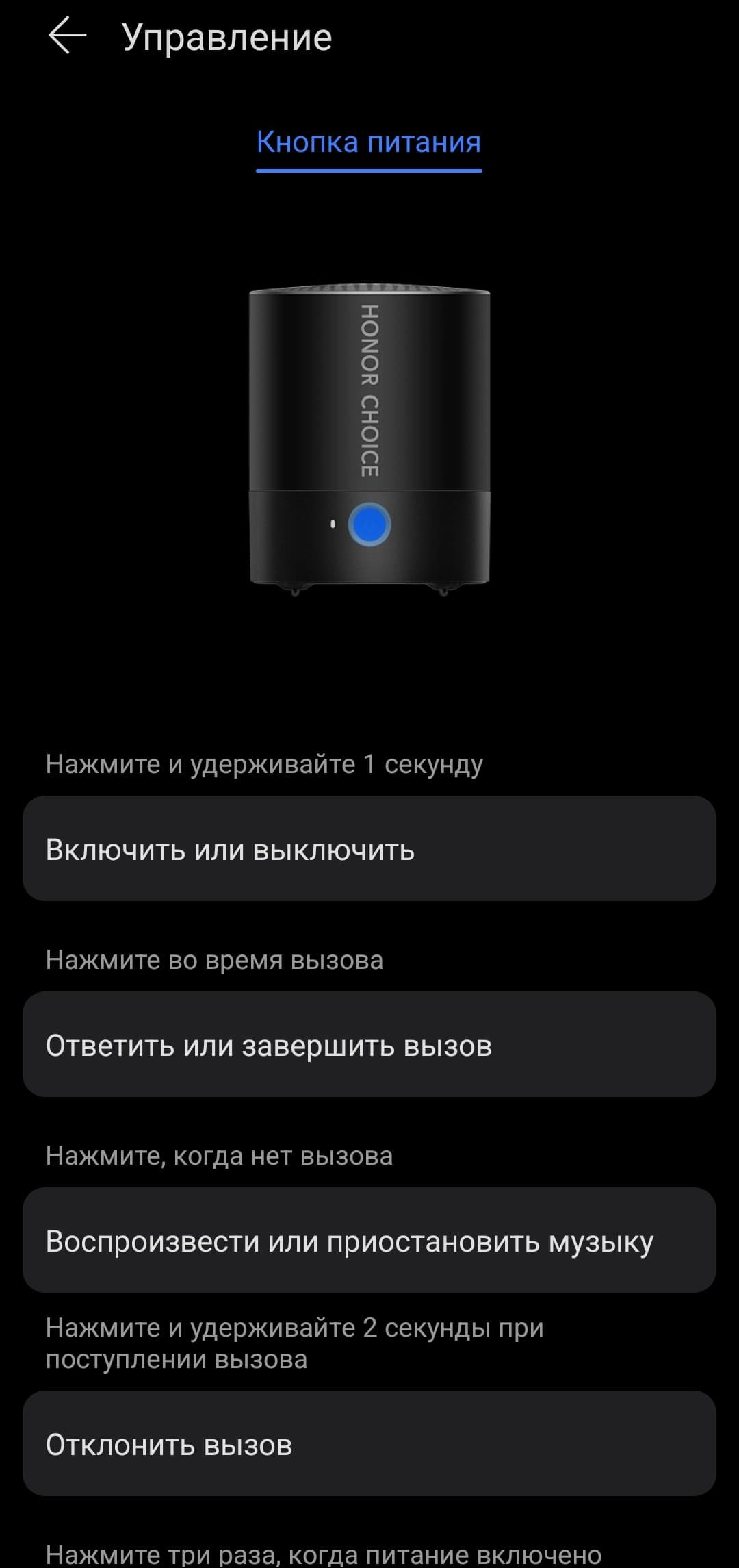 После включения колонка несколько секунд пытается подключиться к уже знакомым источникам, если не получается — активирует режим сопряжения, о чем сообщает звуковым сигналом и миганием LED-индикатора. Также процесс подключения можно запустить тройным нажатием кнопки на лицевой панели. Обладатели мобильных гаджетов Honor с прошивкой Magic UI 6.0 и выше при запуске сопряжения сразу увидят окно установки связи, остальным нужно будет воспользоваться стандартным меню устройства — благо ничего сложного в процессе подключения нет, и занимает он в любом случае не больше минуты.