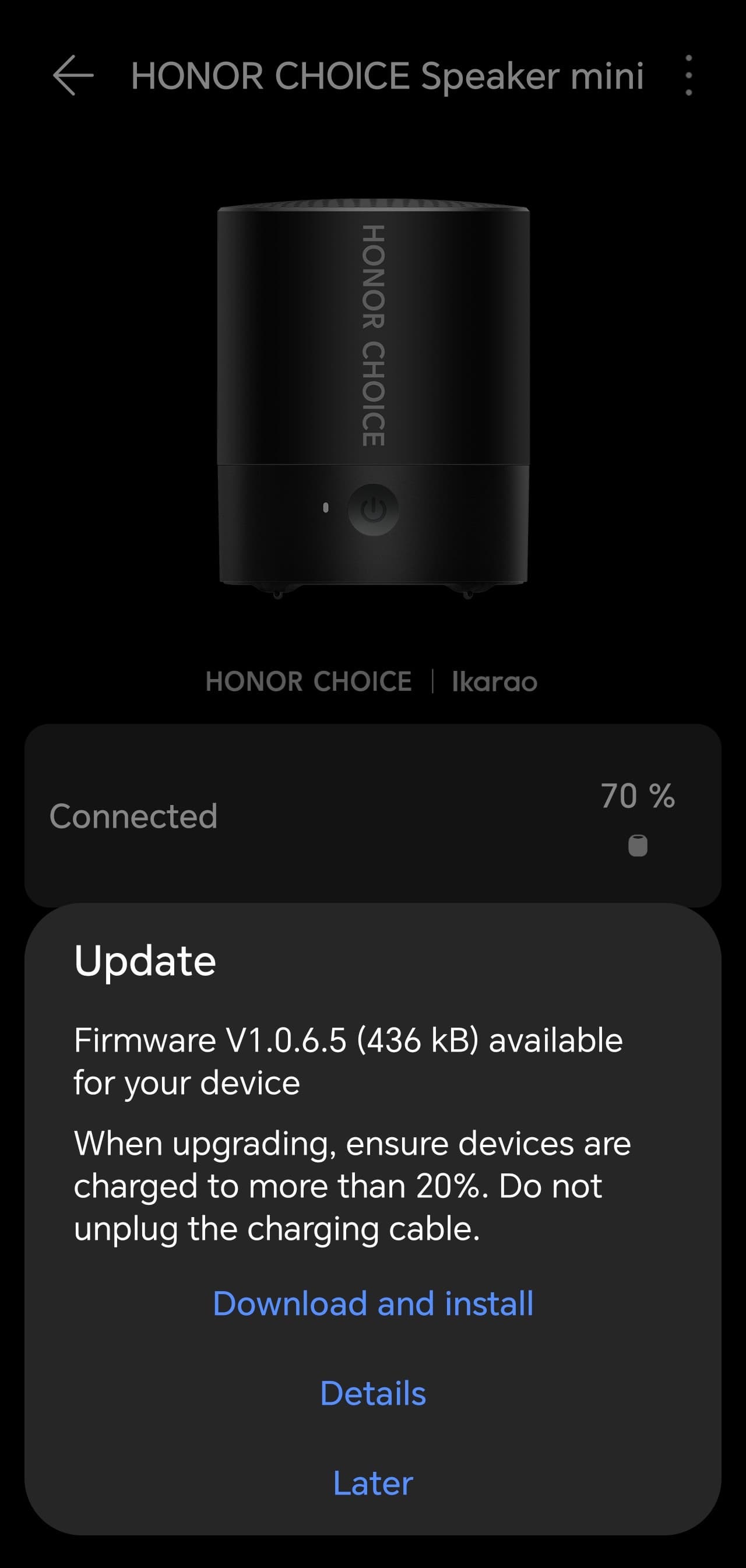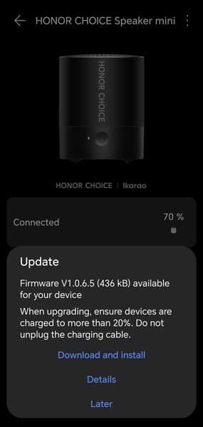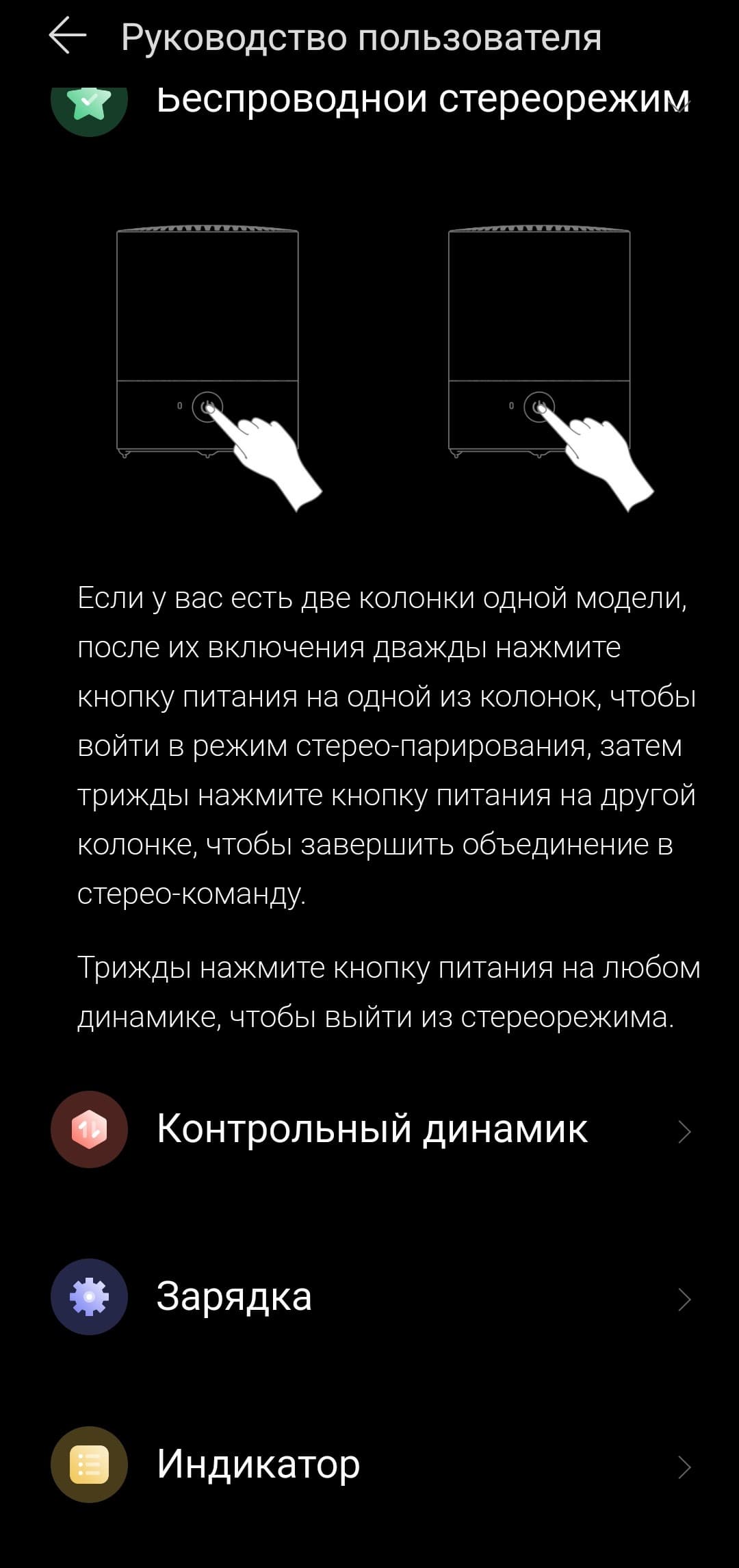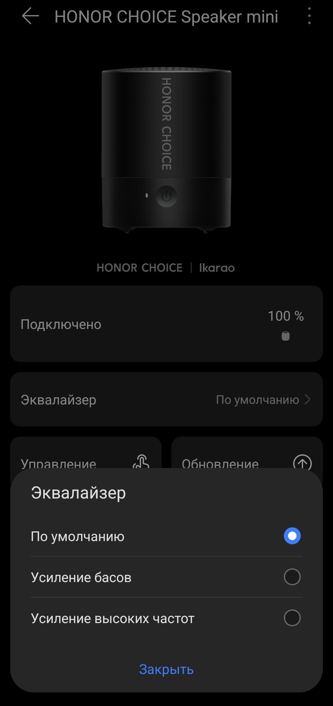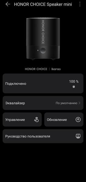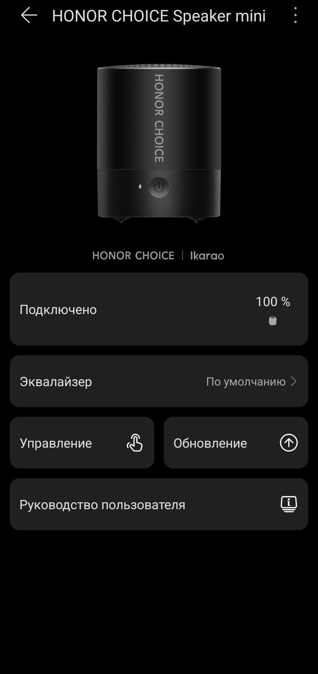 Информация о том, какие нажатия кнопки за что отвечают, есть в приложении Honor AI Space, при этом настроить управление возможности нет. На странице устройства можно увидеть уровень его зарядки, а также выбрать один из трех пресетов эквалайзера. Над модулями управления есть упоминание компании Ikarao — видимо, именно она выступила в качестве партнера по созданию колонки. В прошлом году мы тестировали довольно интересную переносную караоке-систему под этим брендом.
