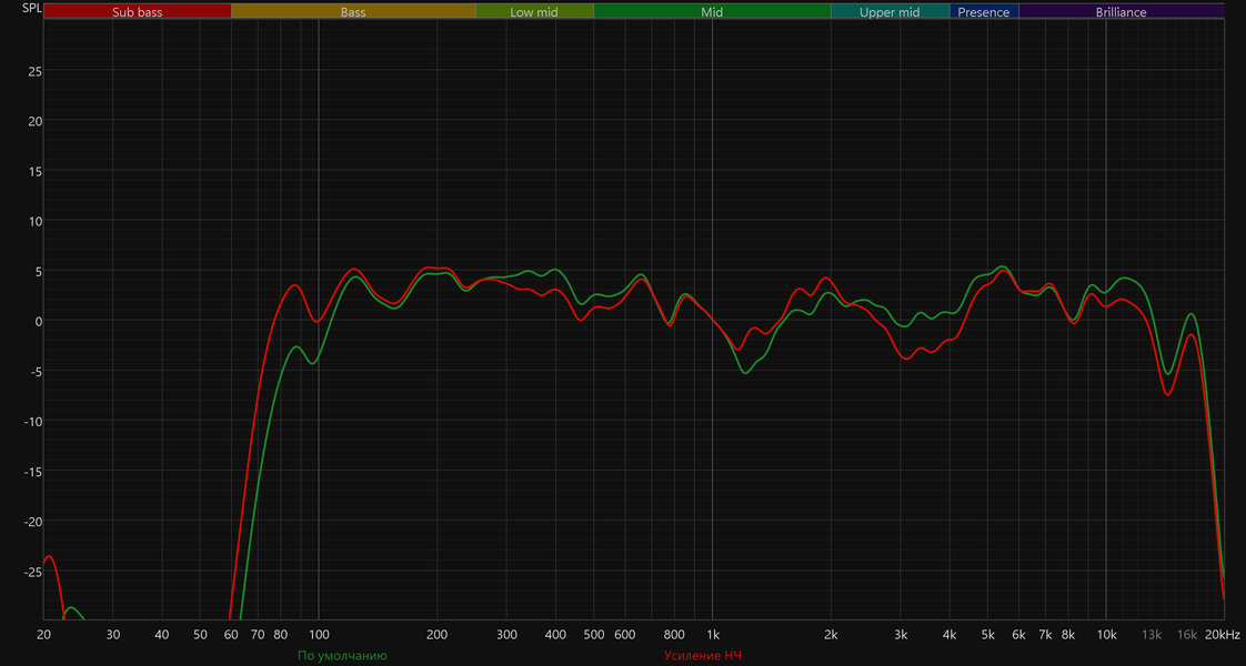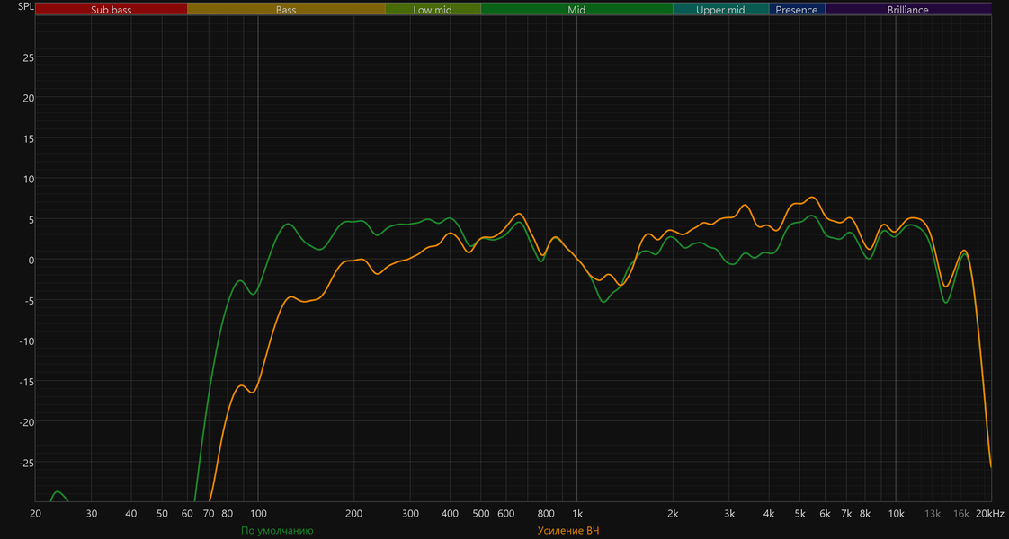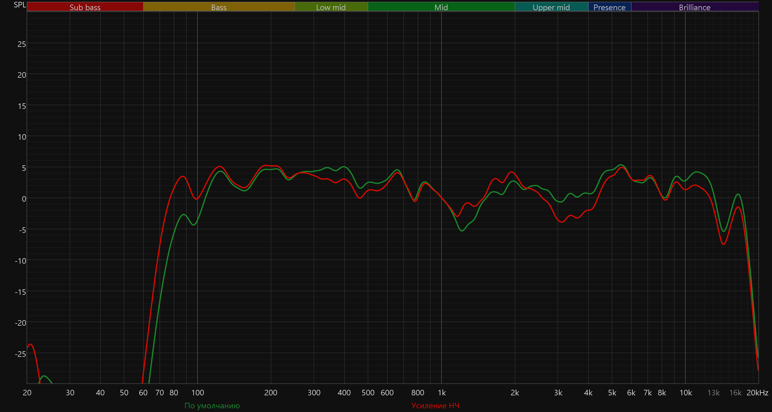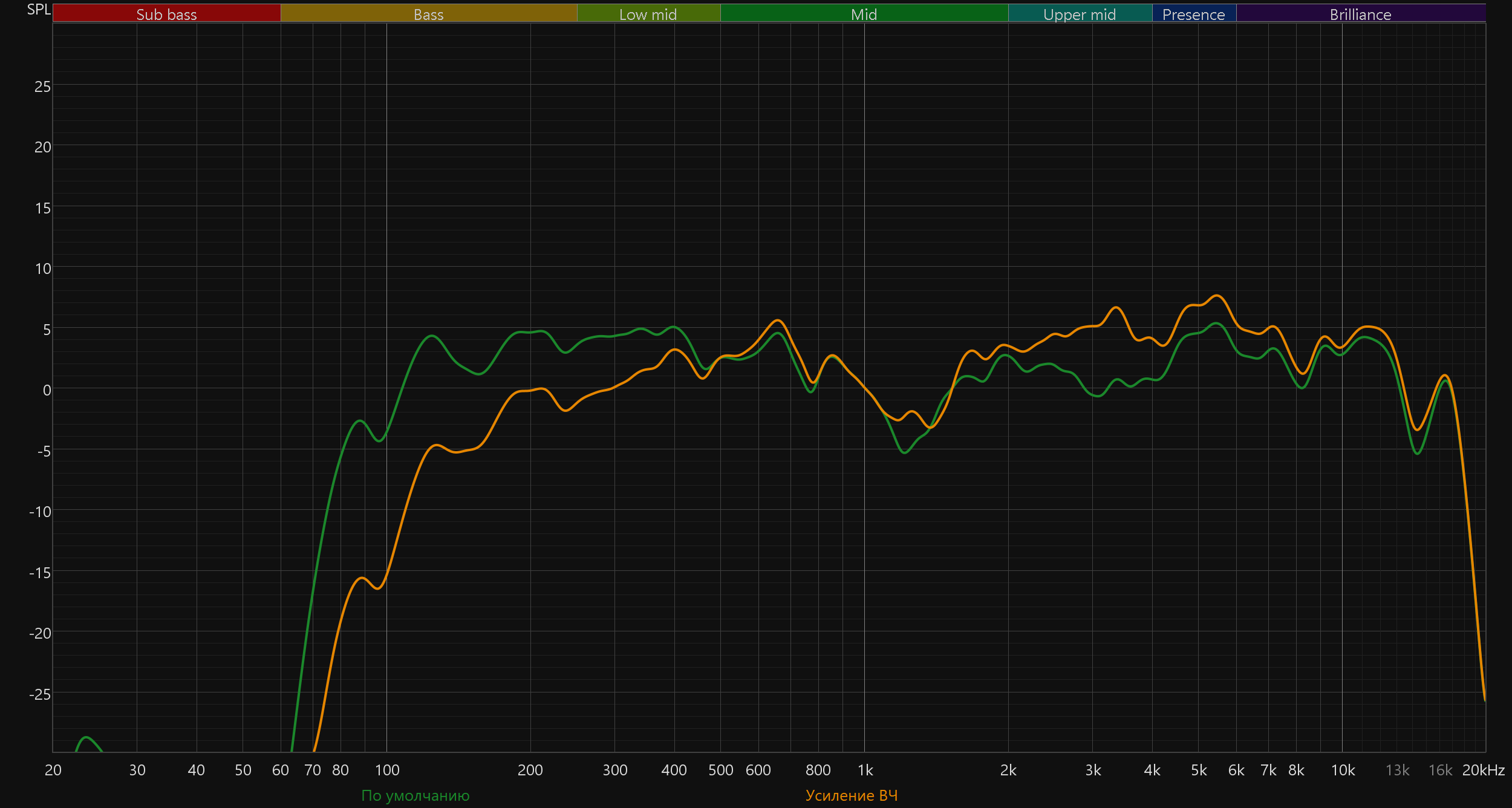 Два пресета эквалайзера более или менее справляются со своей задачей. «Усиление НЧ» происходит не только за счет дополнительного акцентирования баса, но и за счет увода назад СЧ- и ВЧ-регистра, что объяснимо — «выжать» еще больше баса из столь компактного корпуса крайне сложно, спасибо и за тот, что есть по умолчанию. «Усиление ВЧ» происходит одновременно за счет ослабления акцента на басах и подъема непосредственно ВЧ-диапазона, потому активация этого профиля дает гораздо более заметный на слух результат.