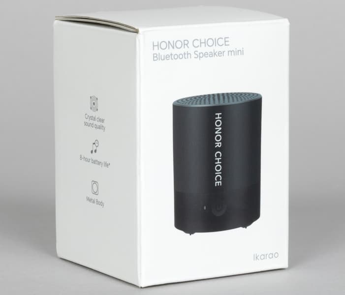 Упакована Honor Choice Bluetooth Speaker mini в коробку из белого картона средней плотности, на которую нанесены изображения колонки, ее название и краткие характеристики. Дополнительно устройство защищено от повреждений с помощью гибкой полимерной накладки.