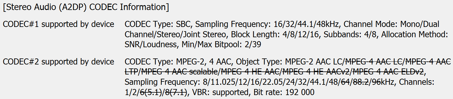 Полный перечень поддерживаемых кодеков и их режимов мы традиционно получили с помощью утилиты Bluetooth Tweaker. Кодека два: базовый SBC и немного более продвинутый AAC.