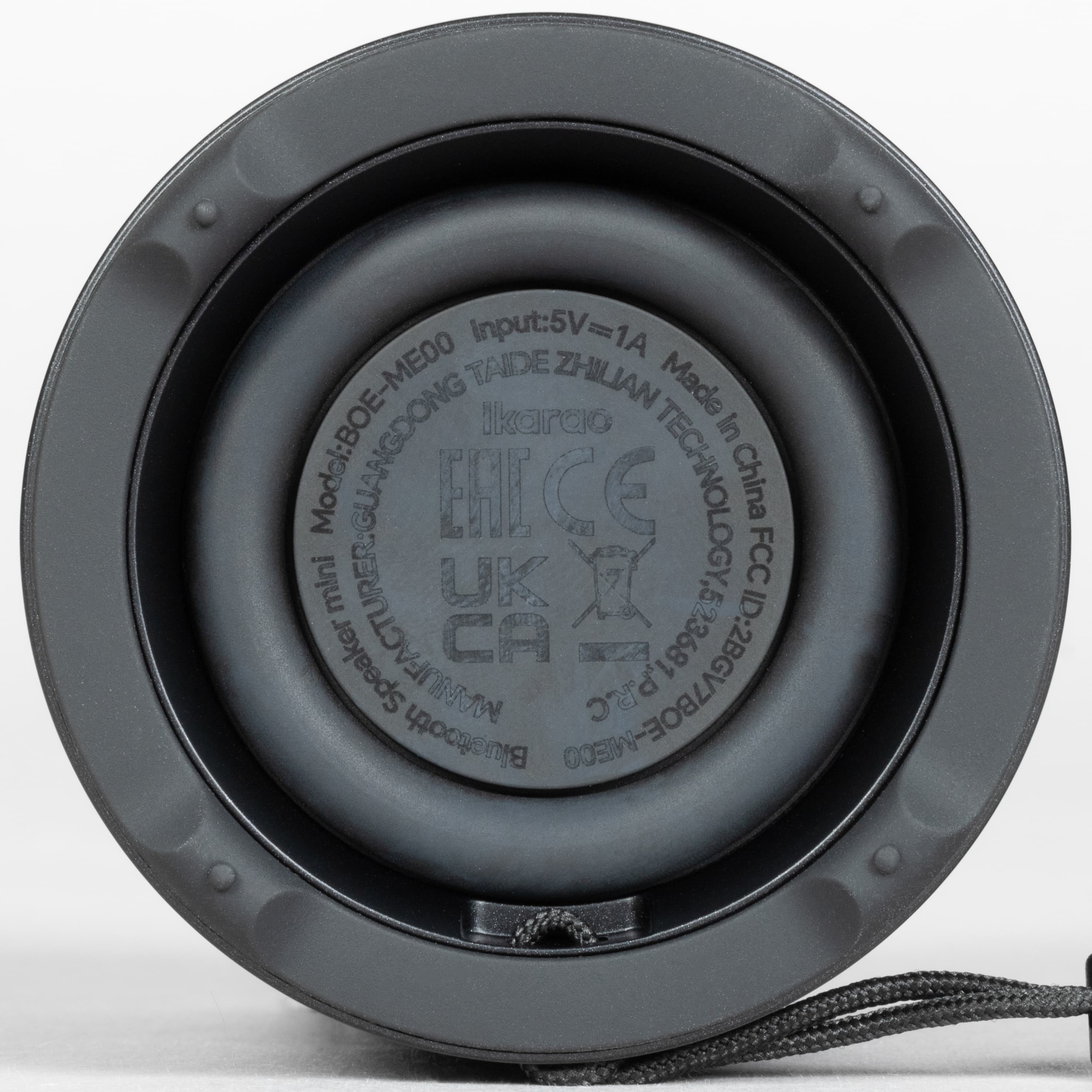 Снизу размещен пассивный излучатель, на который нанесена краткая информация об устройстве, в частности — указан его непосредственный производитель. Как уже упоминалось выше, он является самой уязвимой к механическим воздействиям деталью колонки, но во многом определяет то, как она звучит. Небольшие ножки приподнимают колонку над горизонтальной поверхностью, на которой она установлена, обеспечивая распространение формируемого излучателем звука.