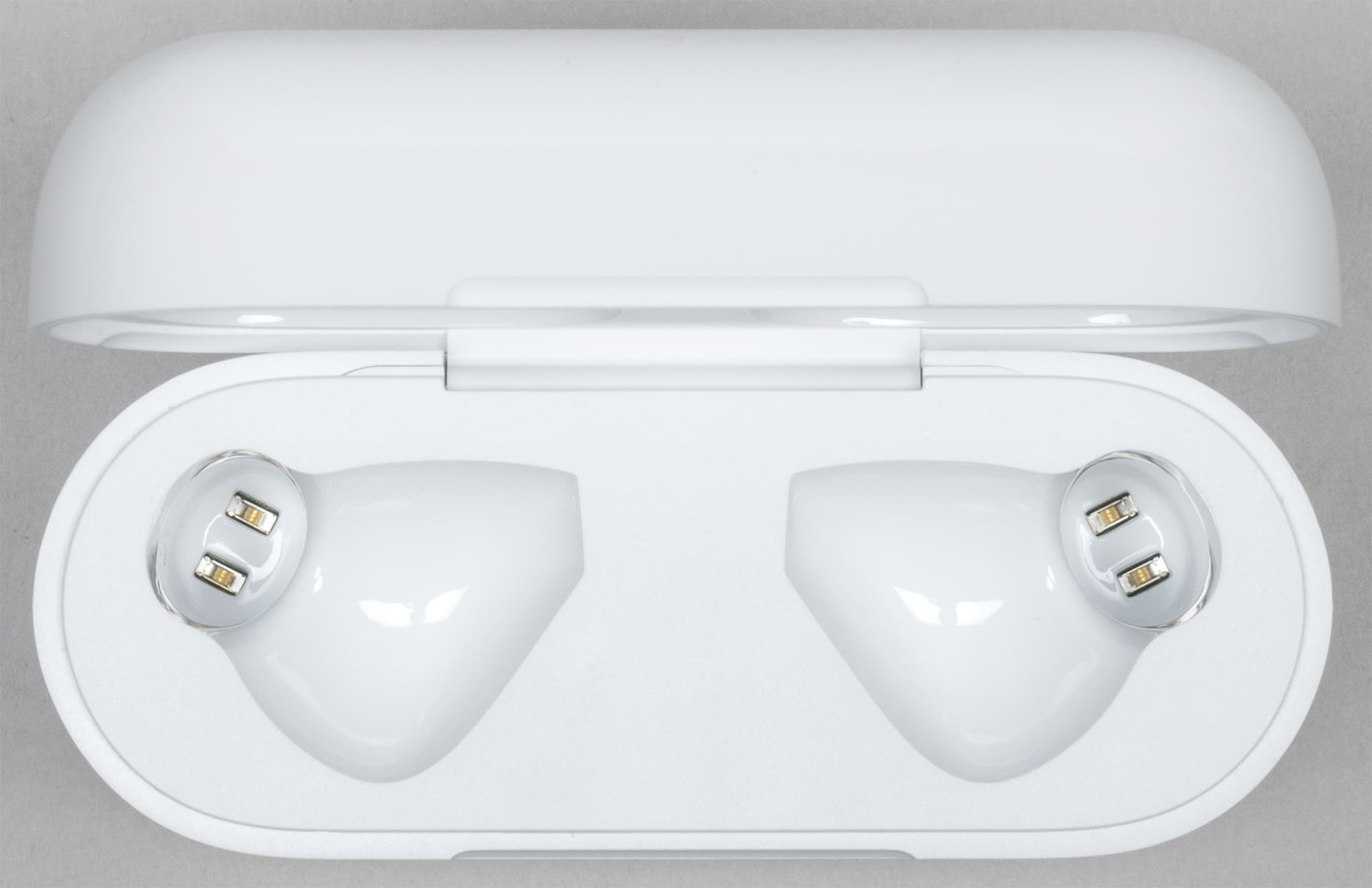 В отверстиях под «палочки» наушников видны контакты для зарядки. Распространенное, но не самое удачное расположение — очистить их в случае необходимости будет тяжело, но вполне возможно.