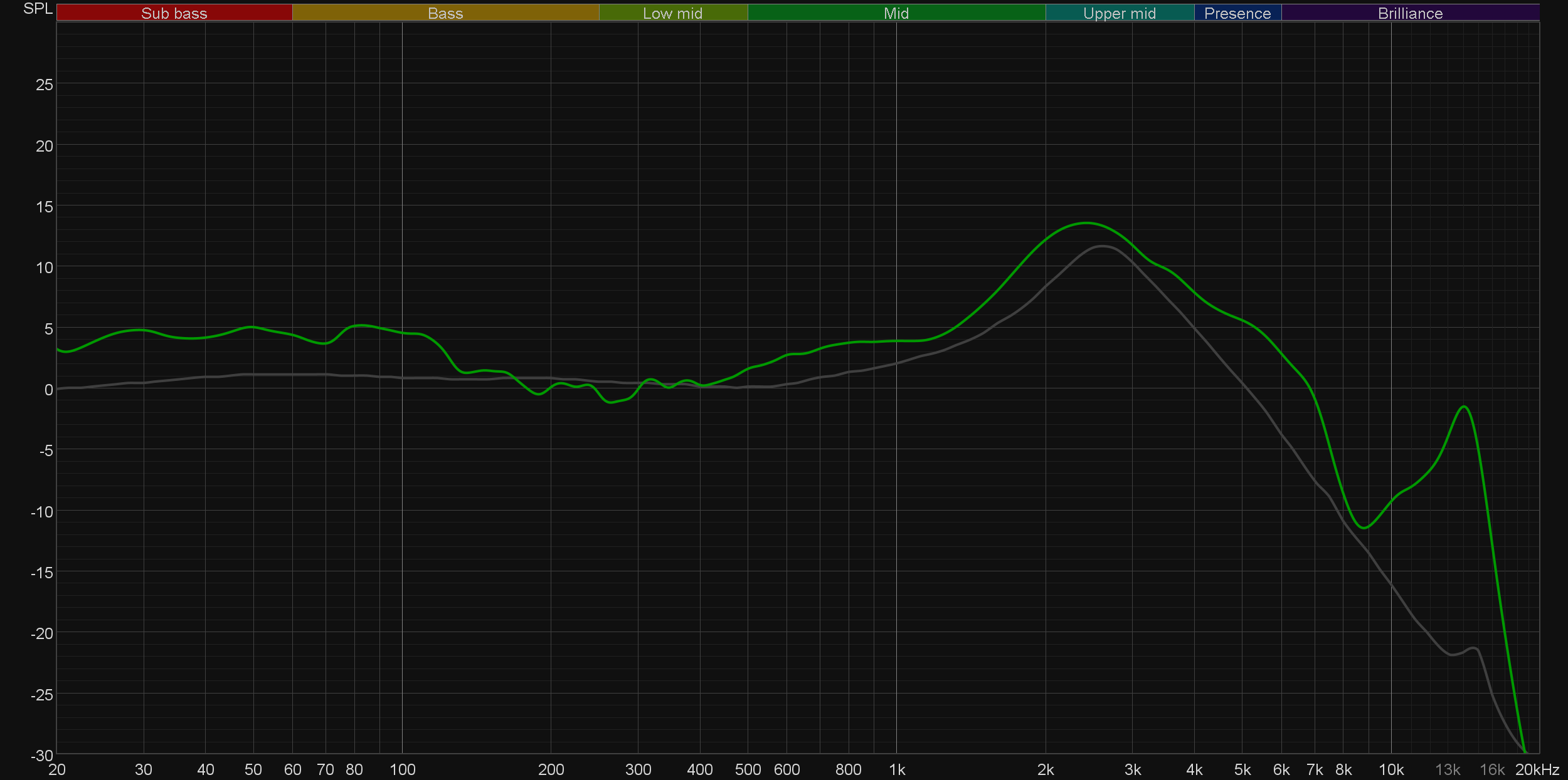 Заметная неравномерность подачи среднечастотного диапазона придает звучанию некоторую окраску, но ухо не раздражает и как дефект не воспринимается. График АЧХ выше показан на фоне кривой IDF (IEM diffuse field compensation), предоставленной производителем используемого стенда. Ее задача — помочь скомпенсировать резонансные явления в имитированном слуховом канале и особенности используемого оборудования, создав «звуковой профиль», максимально корректно иллюстрирующий то, как звучание наушников воспринимается слушателем. Ее можно рассматривать как адаптированный под конкретное устройство аналог так называемой «кривой Хармана», созданной командой Harman International под руководством доктора Шона Олива. Скомпенсируем полученный график АЧХ в соответствии с кривой IDF.