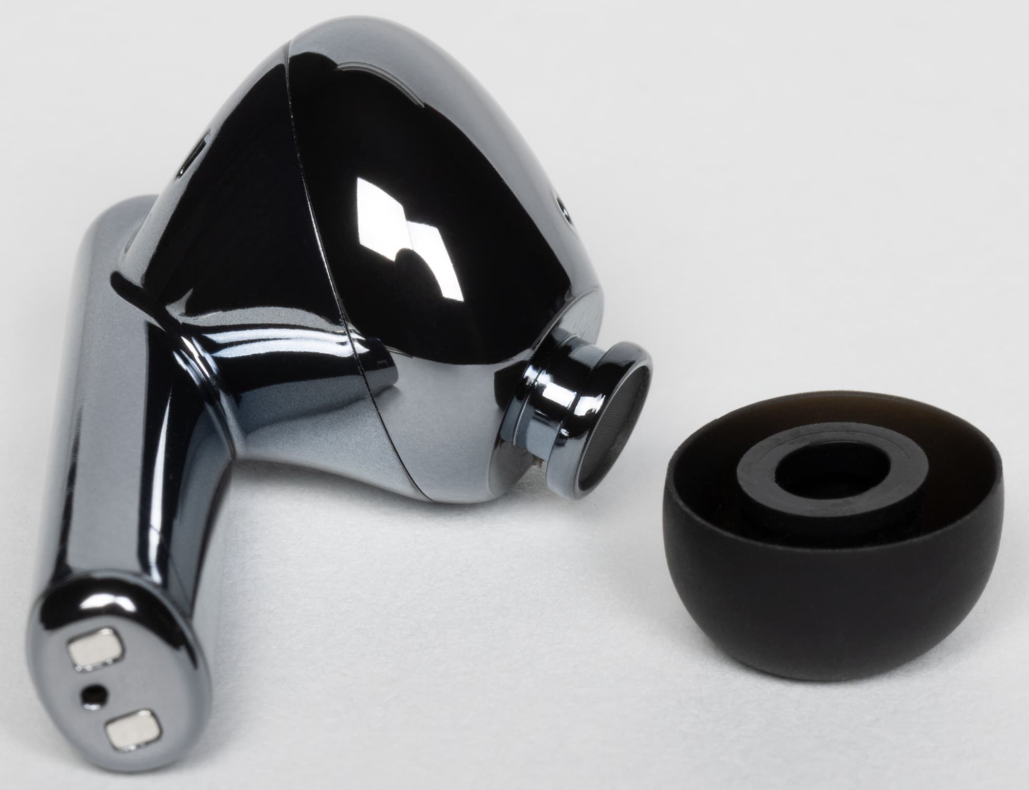 На обращенной к уху при ношении ее поверхности видно отверстие одного из микрофонов, обеспечивающих работу системы активного шумоподавления.