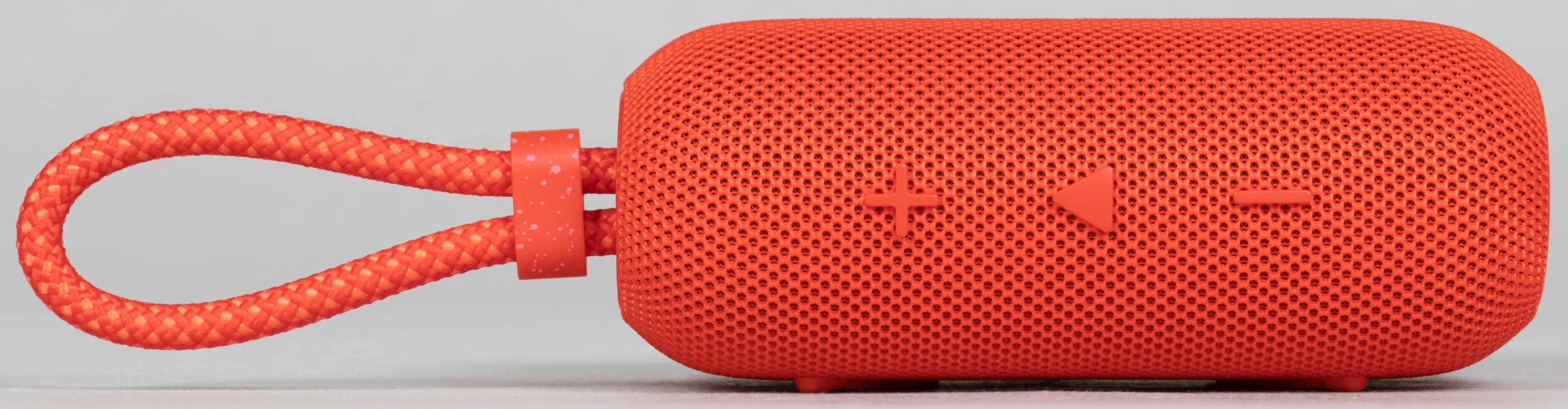 Большая часть корпуса обтянута сеткой, на оставшихся поверхностях мы видим силиконовую накладку. Сбоку размещен маленький шнурок, с помощью которого можно повесить колонку на что-нибудь — от собственного пальца до ветки дерева.