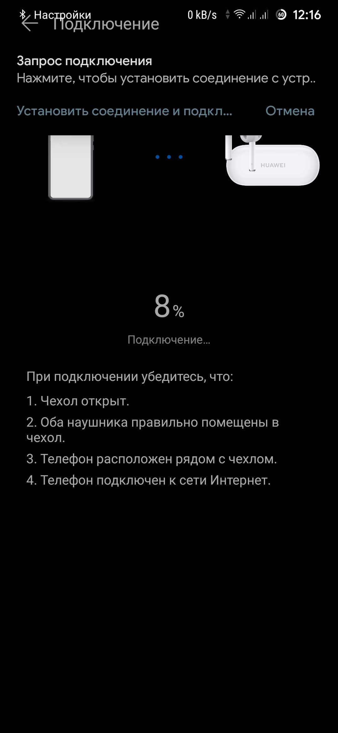 Подключить гарнитуру можно прямо из приложения, нажав «+» на главном экране. Доступна для обнаружения Huawei FreeBuds 3i после открытия кейса и нажатия на кнопку возле порта для зарядки в течение примерно 3 секунд — вынимать наушники не нужно. Поиск занимает всего пару секунд, остается нажать на кнопку подключения и ответить согласием на запрос, появляющийся в виде уведомления. Далее устройство отображается на домашней вкладке приложения, прямо из которой можно перейти на страницу его настройки и проверить, что по умолчанию используется кодек AAC.