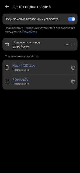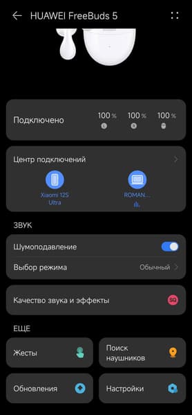 Организацию подключения к нескольким устройствам в линейке FreeBuds мы неоднократно хвалили, сделаем это еще раз: «мультипойнт» реализован максимально удобно. Для сопряжения со вторым устройством достаточно нажать кнопку на боку кейса, не прерывая связи с первым. Далее оно появляется в «Центре подключений» и на главном экране — видно, откуда транслируется звук, можно настроить приоритет того или иного источника. Впрочем, делать это особой необходимости нет, всё и так работает: фокус смещается в нужный момент, оба устройства можно использовать и для общения, и для прослушивания музыки или другого контента.
