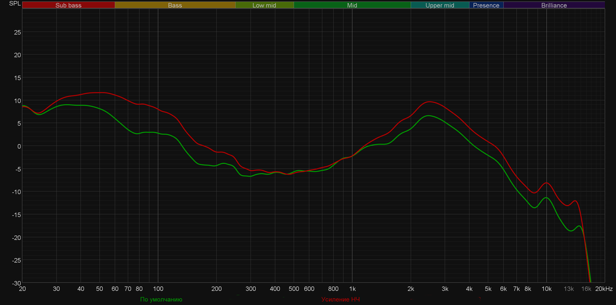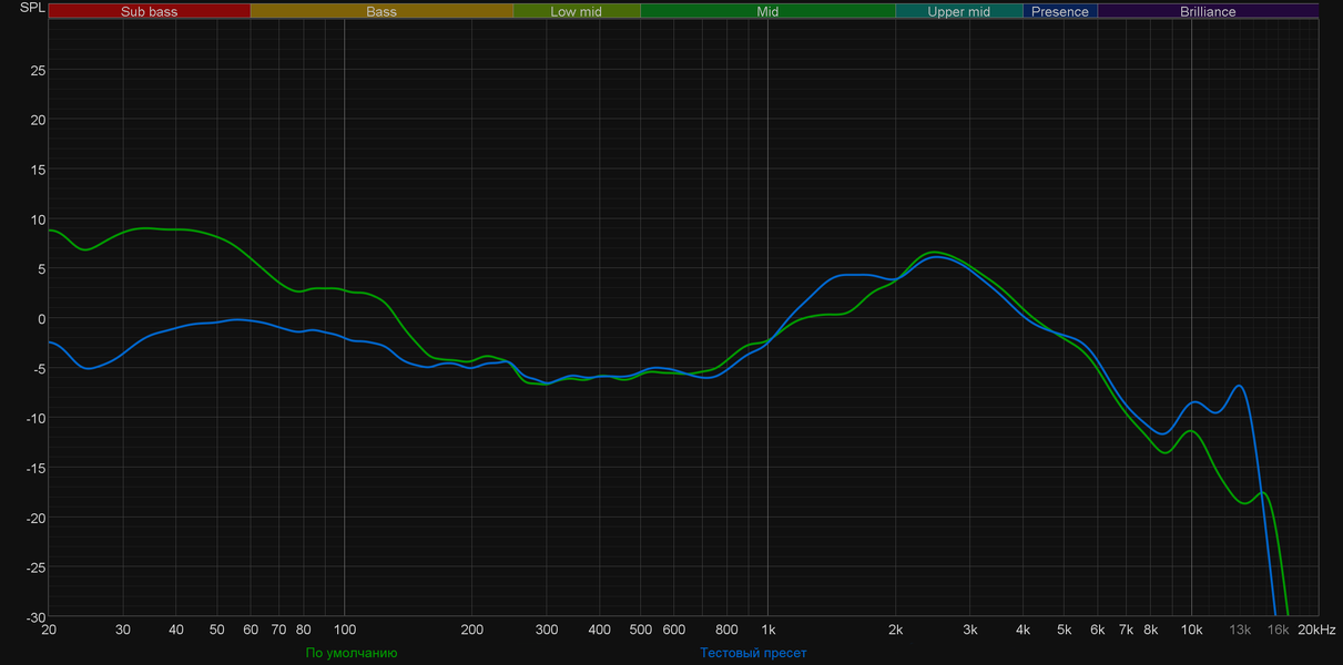 При этом еще раз важно отметить, что акцентом на НЧ-регистре легко управлять. Стоит чуть ослабить посадку, как он воспринимается уже не так остро. Плюс эквалайзер позволяет избавиться от него практически полностью. Предлагаемые пресеты делают ровно то, чего ожидаешь от них, исходя из названия — выделяют высокие или низкие частоты, подчеркивают голос... На последней иллюстрации представлен график, полученный после активации созданного нами профиля, где мы как раз попытались на скорую руку снизить акцент на низкочастотном диапазоне и немного подчеркнуть середину. Как видно, сделать это вполне удалось.