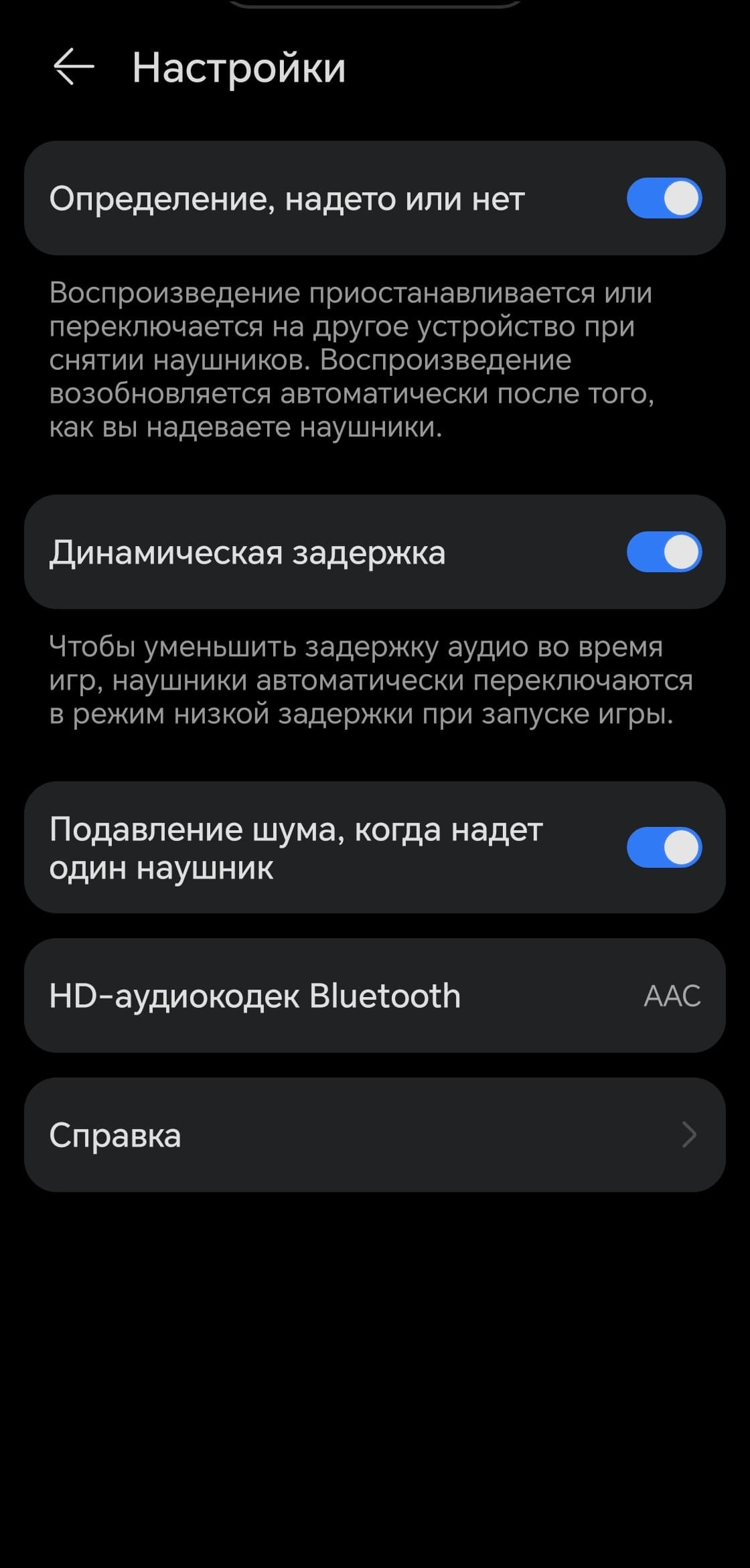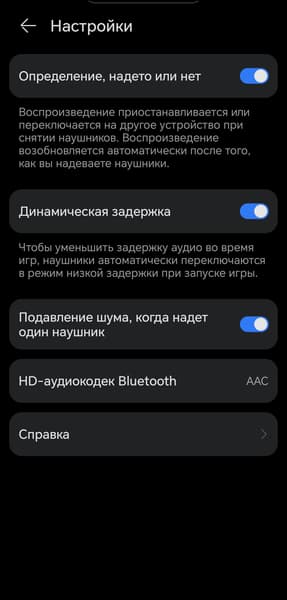 Датчики ношения работают корректно: если вынуть один наушник, воспроизведение приостанавливается, а при возврате — автоматически продолжается. Есть и дополнительная функция — при извлечении одного наушника активируется режим звуковой прозрачности. Это позволяет избежать неприятного ощущения «давления», которое часто возникает, когда в ухе остается только один наушник с активным шумоподавлением. Опция включается в настройках, там же можно полностью отключить автопаузу. В этом же разделе доступны выбор активного кодека, настройка динамической задержки (режим с пониженным битрейтом для игр) и обширная справка в формате вопросов и ответов.