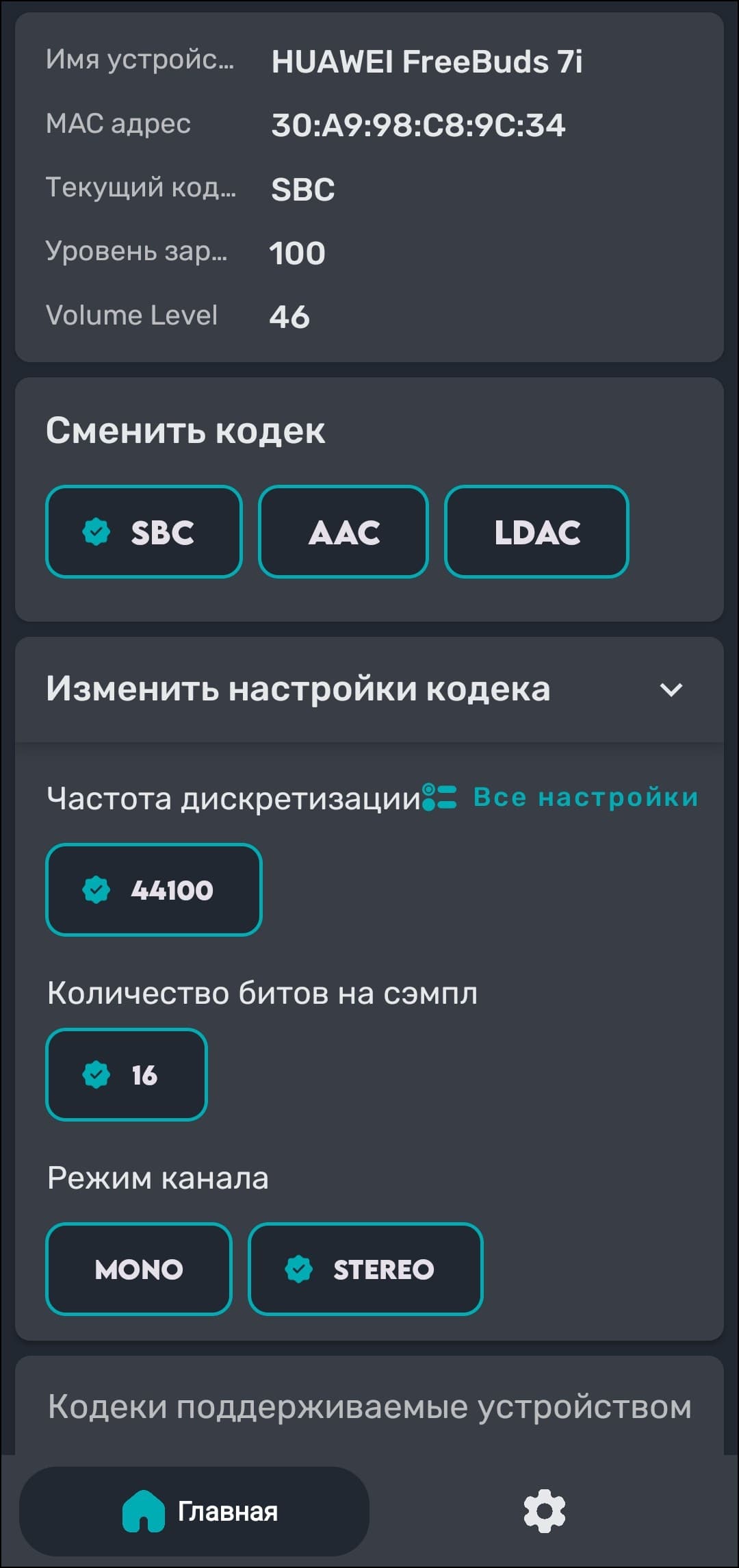 Доступность и режимы кодеков мы дополнительно проверили с помощью утилиты Bluetooth Codec Changer.