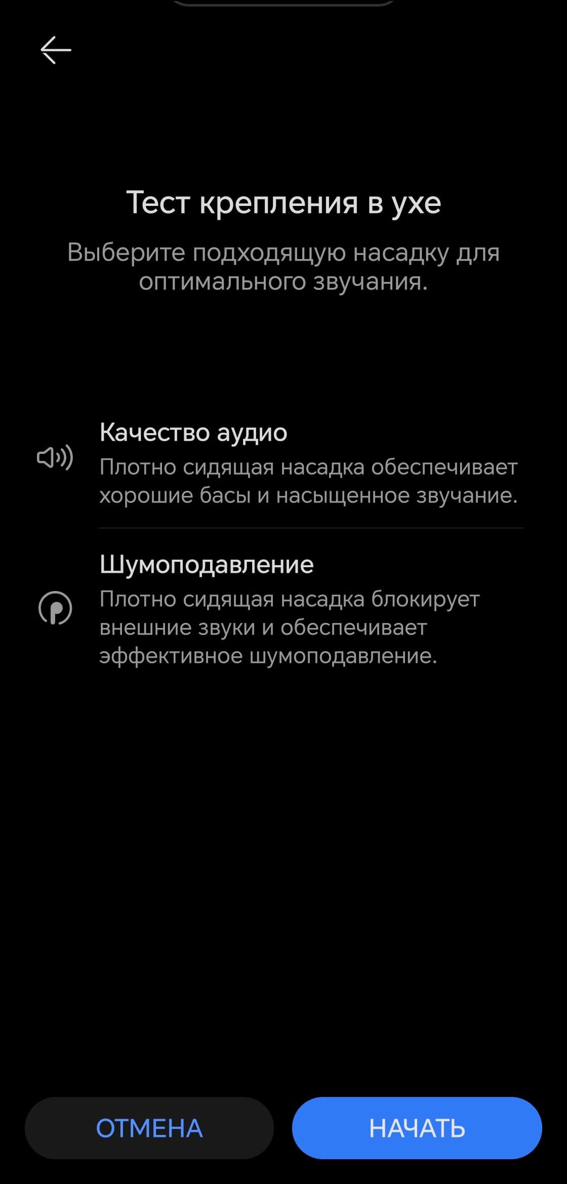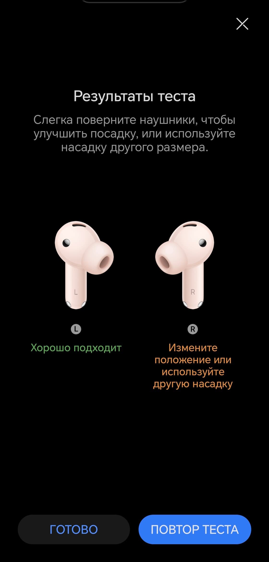 Тест правильности посадки вновь реализован классическим образом. При его запуске наушники воспроизводят короткую мелодию, а внешние микрофоны пытаются ее уловить. Если звук «пробивается» наружу, приложение сообщает о плохой герметичности — стоит попробовать сменить насадки или скорректировать посадку. Мы вновь проверили, как работает функция: слегка ослабили правый наушник — приложение сообщило нам о необходимости поправить его положение или сменить насадку.