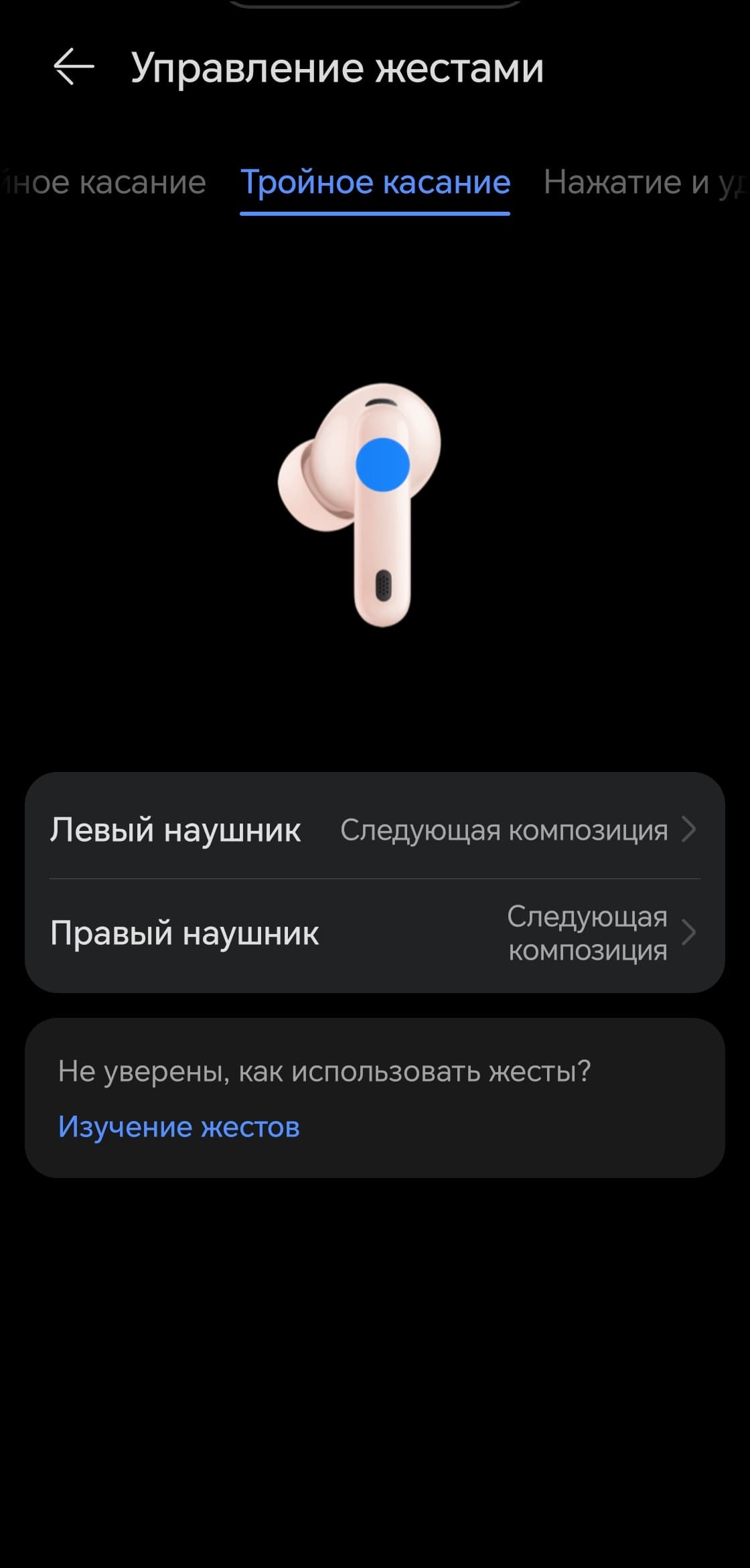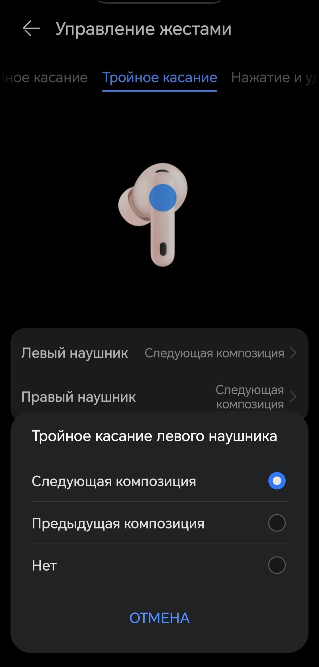 Доступна и настройка тройного касания, но выбора, по сути, нет — можно назначить только переключение треков. Соответственно, имеет смысл оставить за двойным нажатием управление воспроизведением, а при необходимости — добавить на один из наушников активацию голосового ассистента.