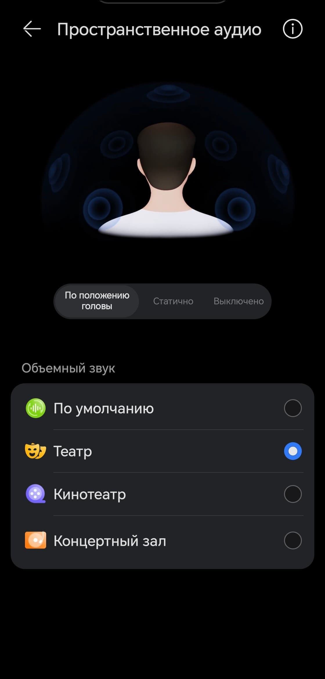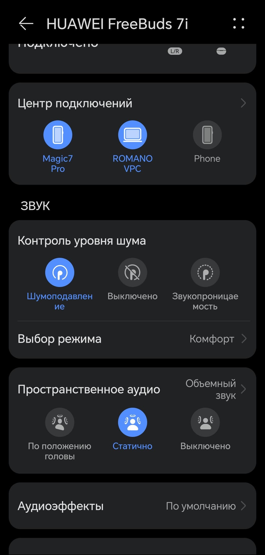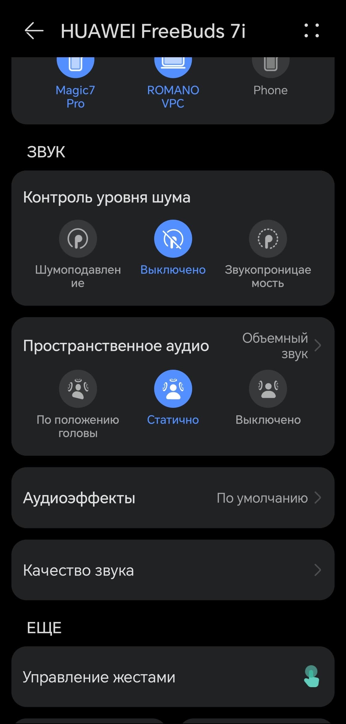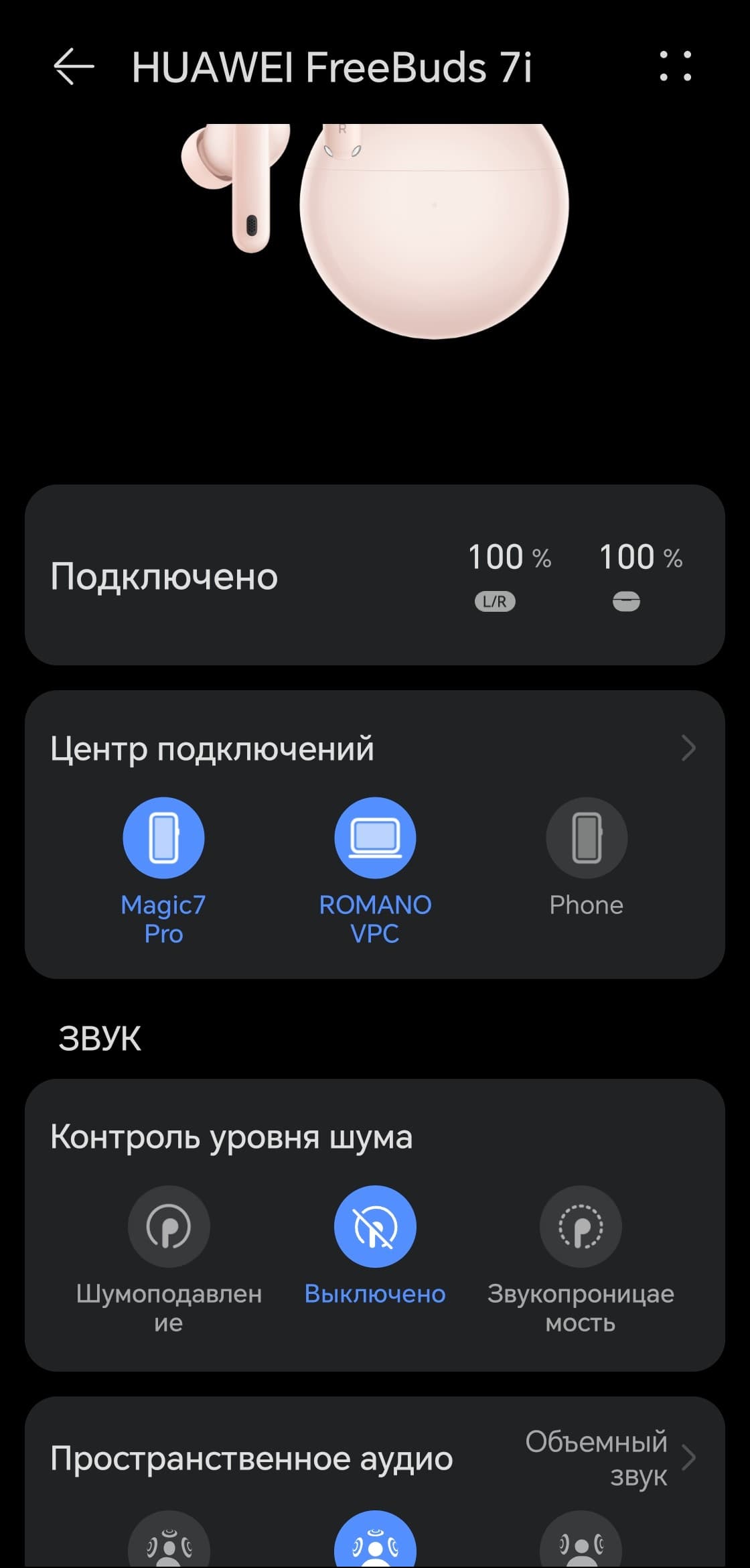Одно из самых интересных нововведений Huawei FreeBuds 7i — так называемое пространственное аудио. В статичном режиме оно просто добавляет дополнительного объема за счет реверберации. На музыкальном материале это звучит довольно спорно, хоть порой и эффектно. А вот в кино такая подача, как правило, оказывается к месту. При активации режима отслеживания положения головы звуковая сцена «привязывается» к экрану — при повороте головы создается ощущение, что источник звука остается на месте. Возникает эффект, будто звук идет не из наушников, а напрямую с устройства — смартфона или планшета перед вами. Поворачиваете голову — и звук смещается в одно ухо, как если бы экран действительно оставался неподвижным. Деталь вроде бы и незначительная, но в долгом и утомительном перелете, например, способна добавить немного уюта, который точно не будет лишним.