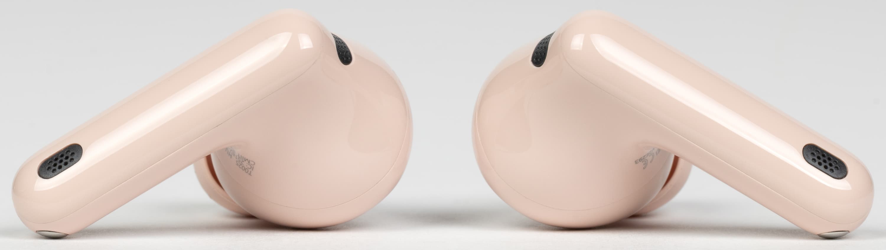 На внутренней стороне «ножек» нанесены обозначения левого и правого наушников. Внешняя панель сенсорная, но визуально это никак не выделено — в отличие от некоторых других TWS-наушников здесь нет характерных углублений или текстурированных участков, помогающих легче нащупывать сенсорную зону. Впрочем, это скорее дополнительная удобная мелочь, а не обязательный элемент, потому ее отсутствие вряд ли можно считать недостатком.