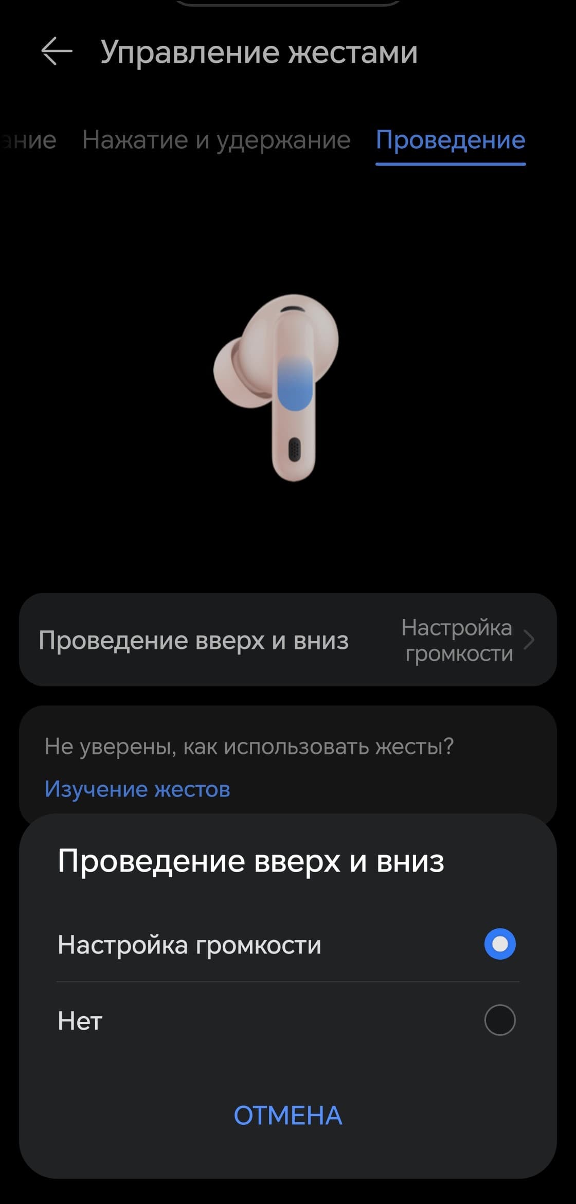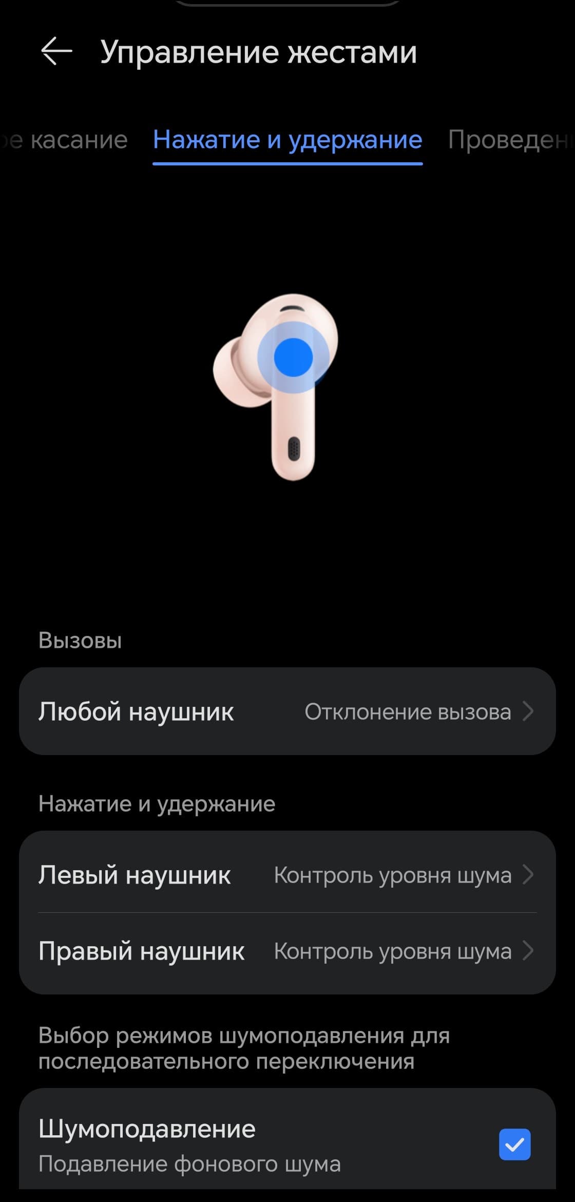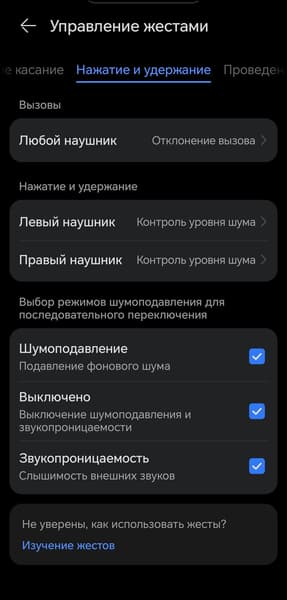 Касание и удержание отвечает за переключение режимов шумоподавления — при этом в настройках можно выбрать, между какими именно режимами переключаться. Свайпы управляют громкостью. Эту функцию можно только отключить — переназначить на другое действие нельзя.