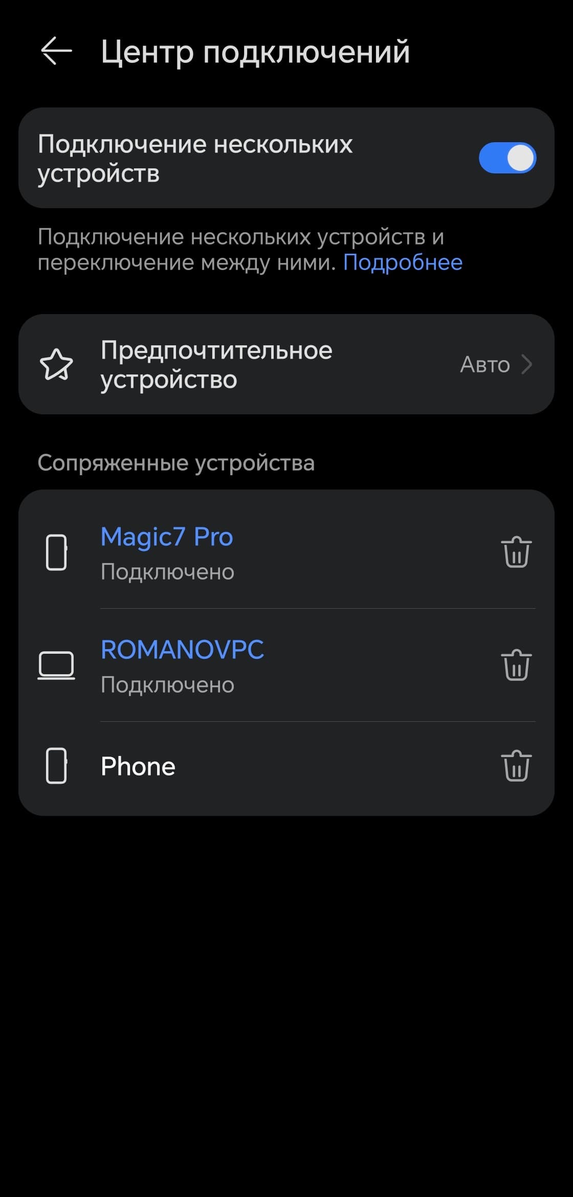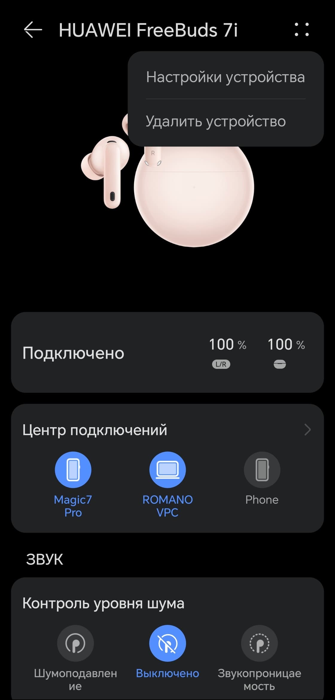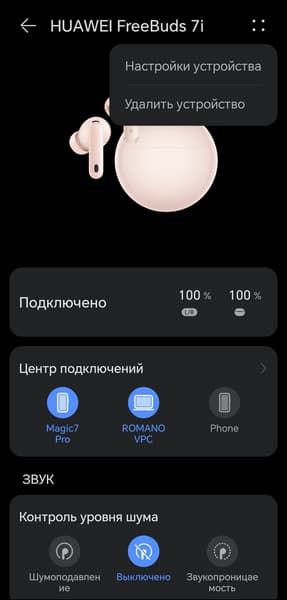 Под изображением гарнитуры на главном экране находится модуль, в котором отображается уровень заряда наушников и кейса. Далее размещен виджет центра подключений, который мы неустанно хвалим — Huawei первыми организовали его таким образом, сейчас мы периодически встречаем нечто подобное у других производителей. На странице его настроек можно увидеть полный список сопряженных устройств с возможностью удалить ненужные, а также выбрать предпочтительные, если это необходимо. Мы за все годы тестирований наушников Huawei так и не смогли найти причин воспользоваться этой опцией — автоматика отлично справляется сама, оперативно переключая фокус между устройствами в нужный момент.