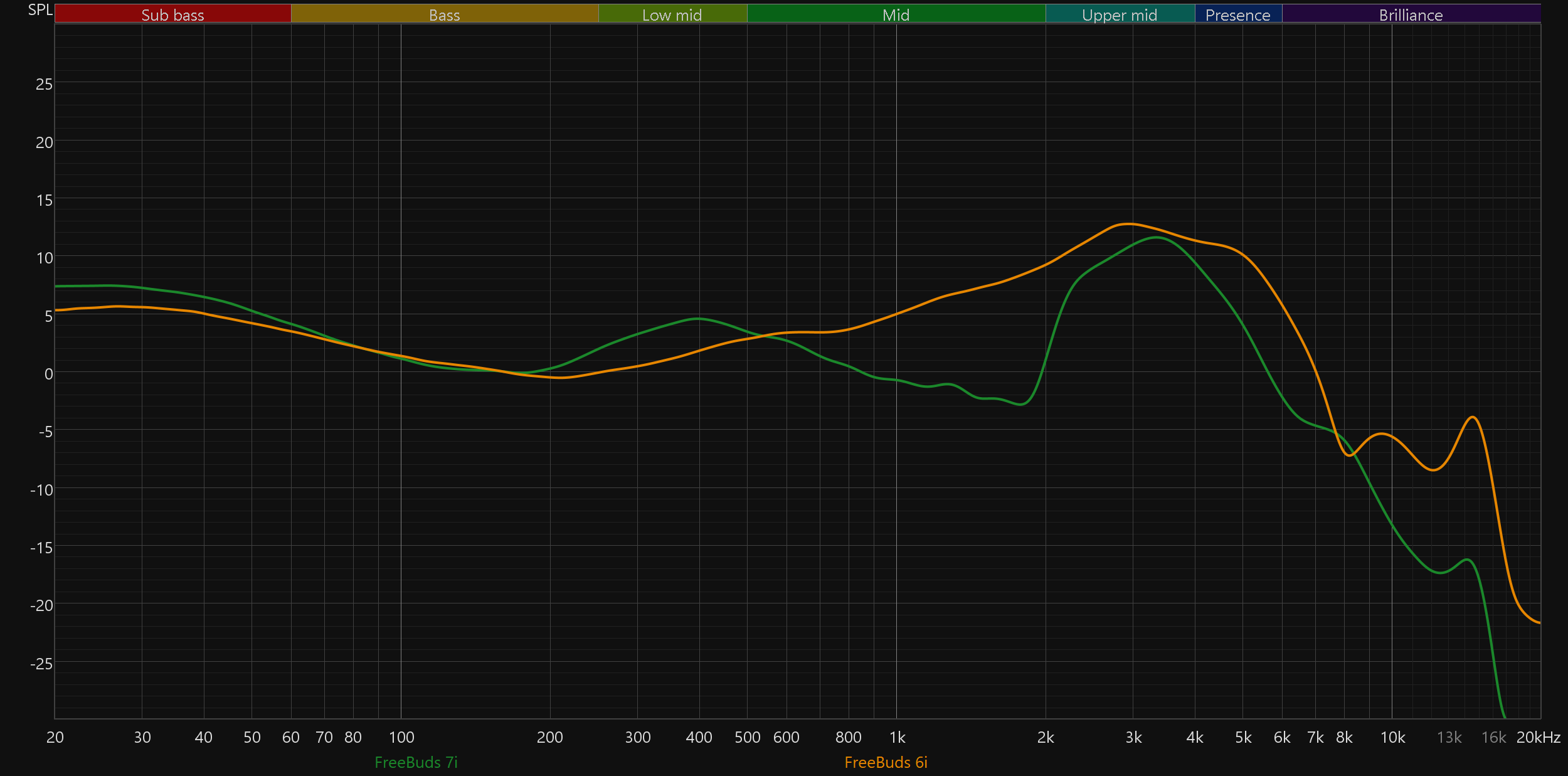 И напоследок — сравнение графиков АЧХ FreeBuds 7i и предыдущих моделей линейки. Хорошо видно, что Huawei постепенно двигается в сторону более эффектного звучания с яркими акцентами. Вероятно, это ответ на запрос аудитории, предпочитающей именно такую подачу. Но все же мы рады, что более сбалансированные пресеты остались доступными и легко активируются, а сами наушники неплохо поддаются эквализации.