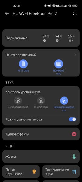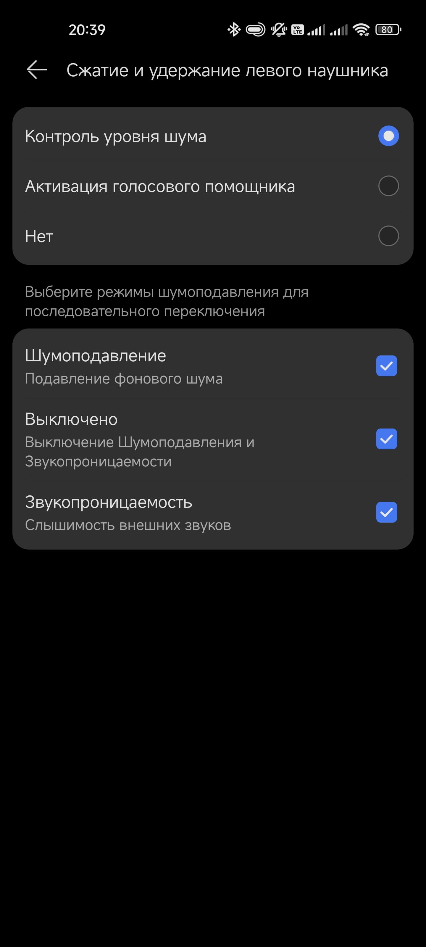 Раз уж начали говорить про Huawei AI Life — продолжим. Следующий блок иконок позволяет включать и выключать шумоподавление, а также выбирать режим его работы. Там же можно активировать функцию «звуковой прозрачности», позволяющую улавливать внешние звуки с помощью микрофонов и транслировать их в динамики наушников. Опция «усиление голоса» подчеркивает среднечастотный диапазон, делая более различимыми голоса людей.