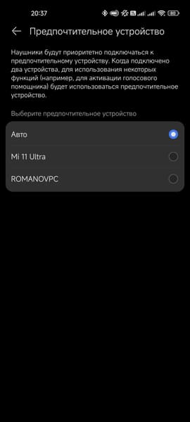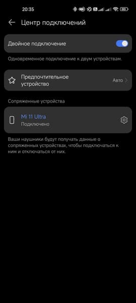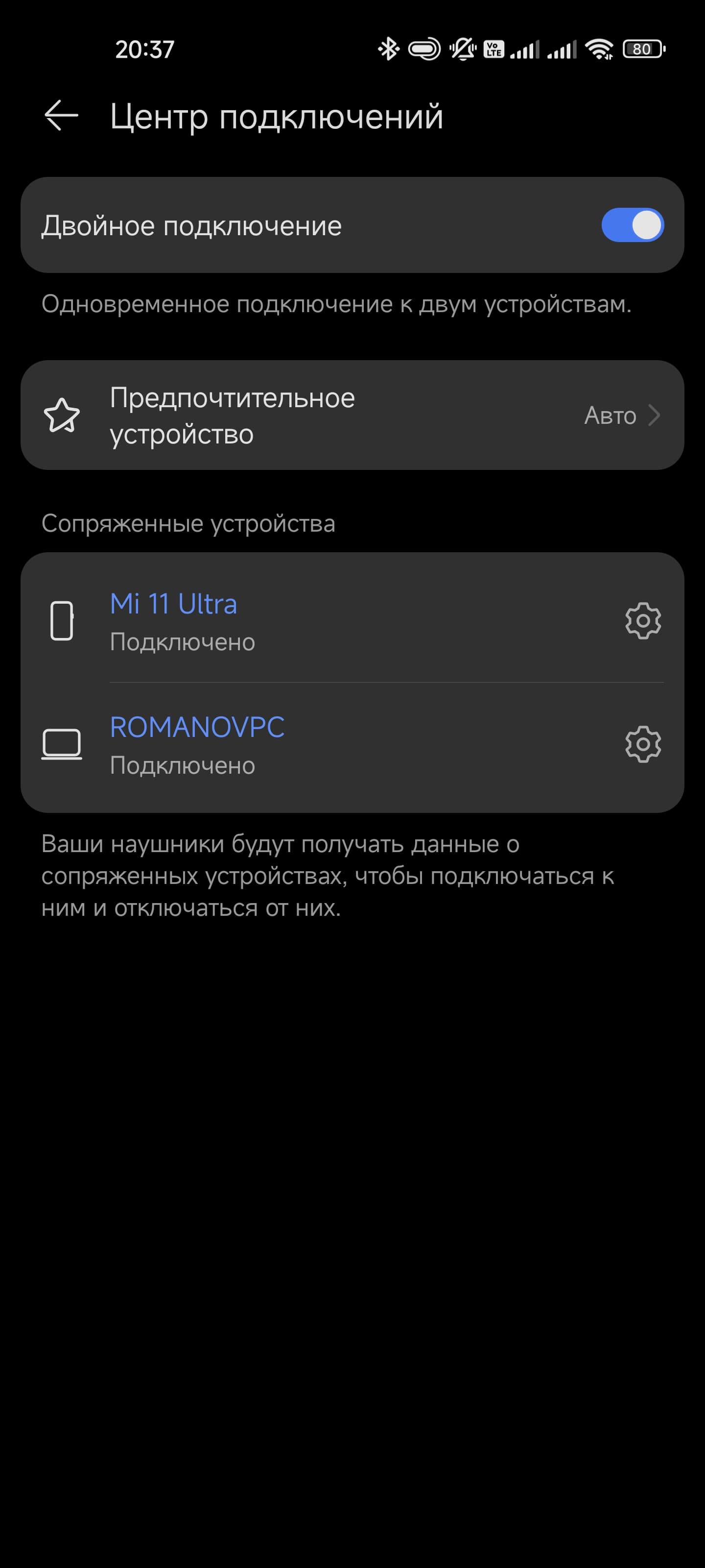 Под блоком с информацией об уровне зарядки находится «Центр подключений», позволяющий управлять двумя устройствами, одновременно служащими источниками звука. Вместе с уже подключенным смартфоном добавим ПК под управлением Windows 10. Сразу отметим, что перемещение фокуса происходит быстро и в нужный момент, в том числе — во время поступления вызова. Приоритетное устройство можно выбрать в соответствующем меню, но у нас в ходе тестирования ни разу не возникло такого желания — в автоматическом режиме все работает как надо.