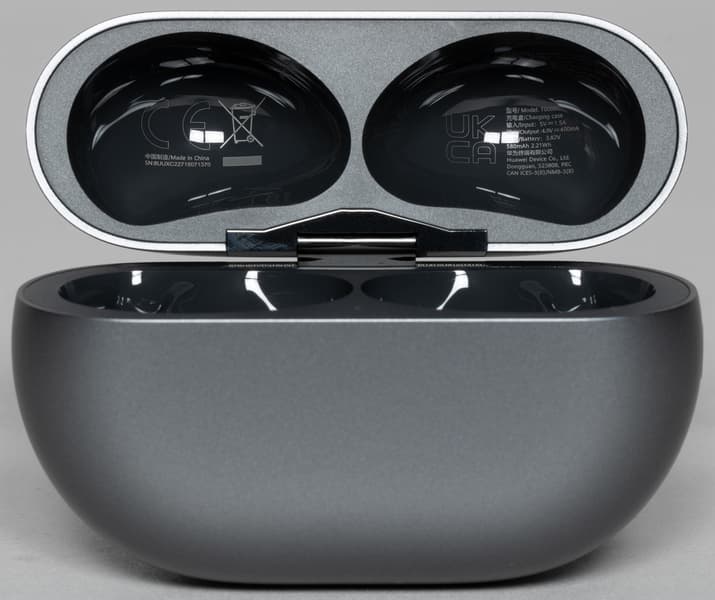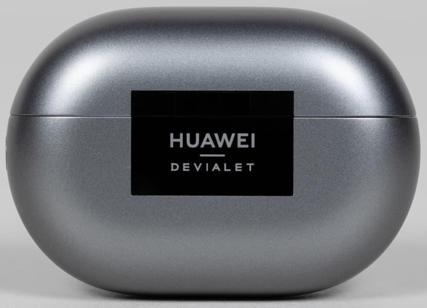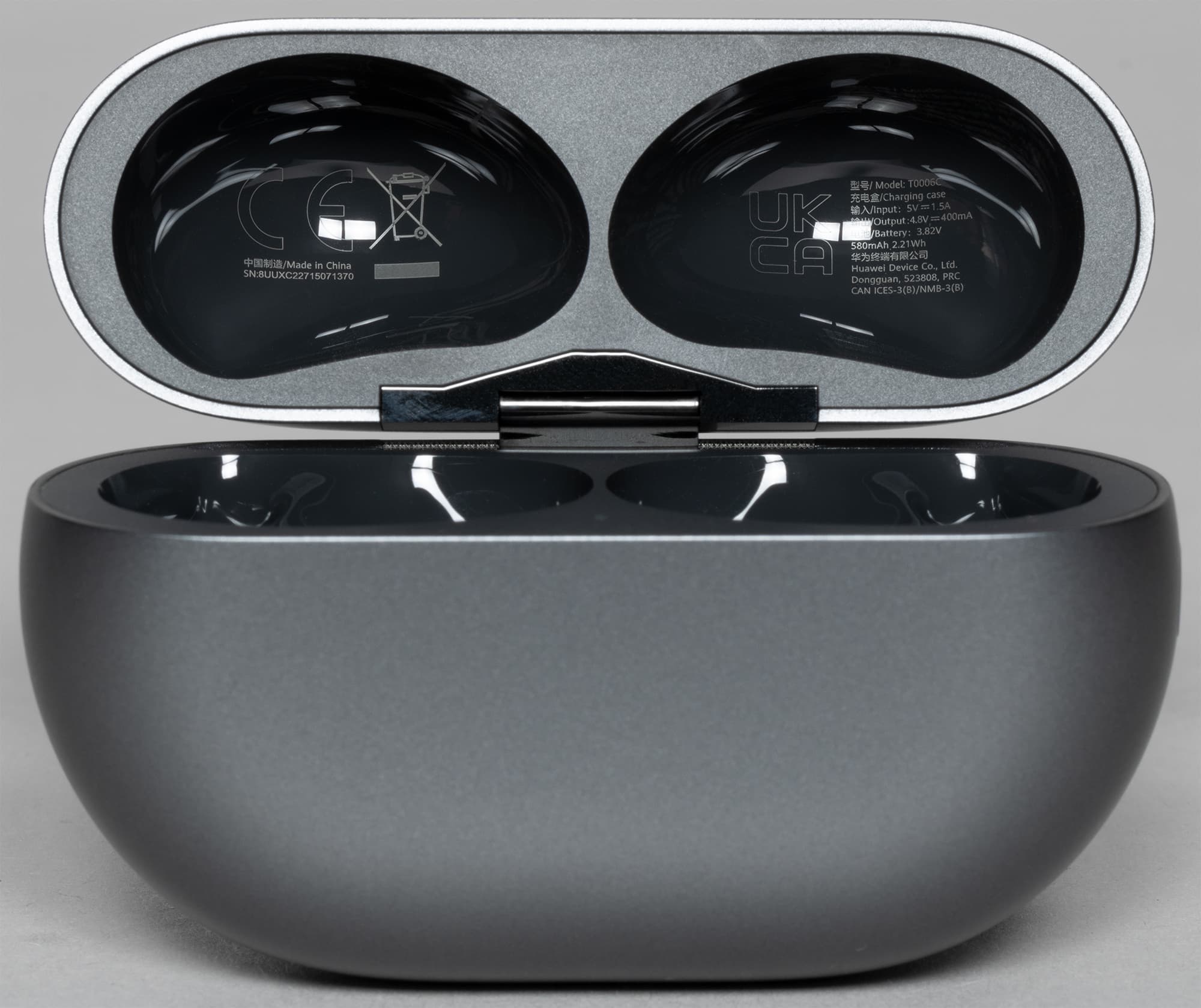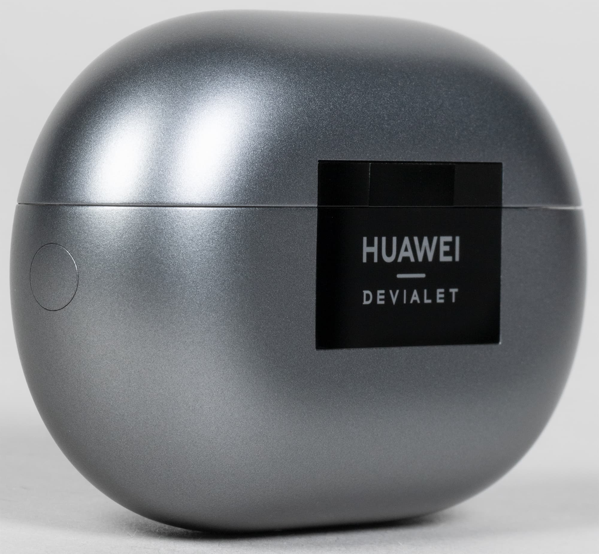 Кейс по-прежнему сложно назвать компактным, но у Huawei FreeBuds Pro он отлично помещался в карман брюк благодаря небольшой толщине, а во второй версии габариты еще немного уменьшились — стало совсем хорошо. На боковой поверхности видна кнопка, позволяющая принудительно запустить процесс сопряжения с источником звука.