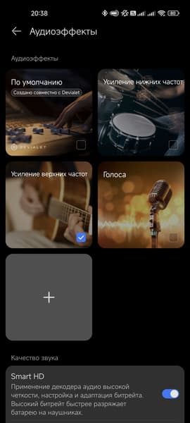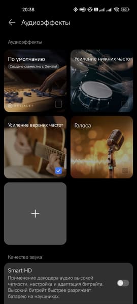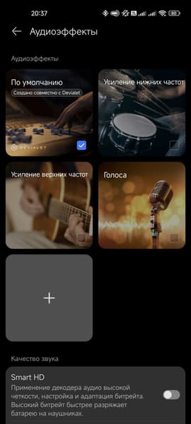 Один из самых интересных разделов — конечно, «Аудиоэффекты». Он позволяет выбрать какой-либо из предустановленных профилей звучания, по умолчанию активирован созданный с помощью специалистов из Devialet.