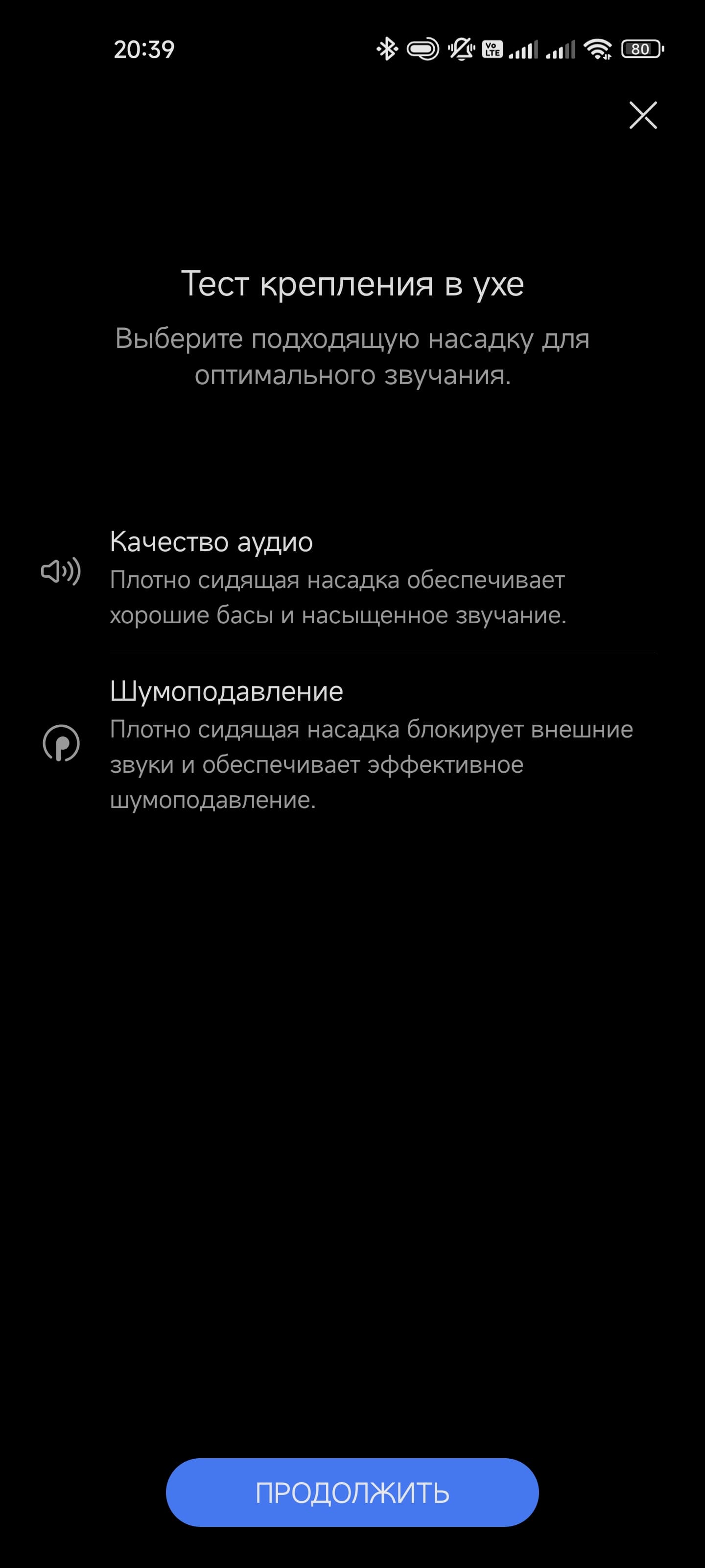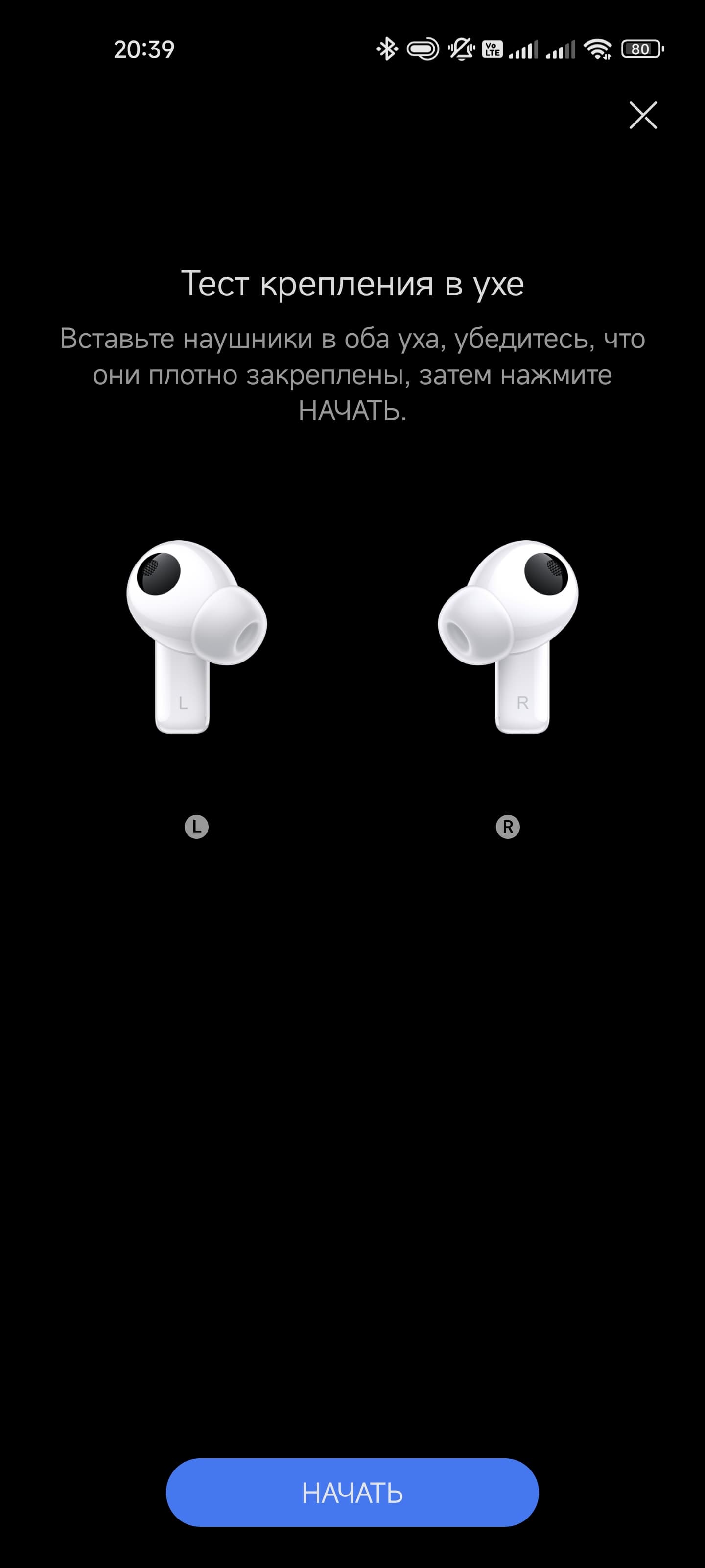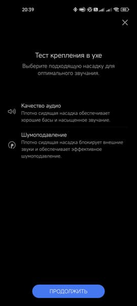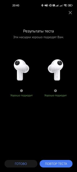 Ну и еще раз покажем тест крепления наушников в ухе, о котором мы неоднократно говорили раньше. Отличная функция: слишком уж часто недостаточно эффектный звук, плохая посадка и прочие проблемы связаны с тем, что пользователь поленился подобрать подходящие себе силиконовые насадки. Тут же можно сразу и без лишних экспериментов понять, подходят или нет. Принцип действия простой: динамики играют приятную мелодию, а внешние микрофоны пытаются ее уловить. Если получается — значит уровень утечек великоват, наушники сидят плохо. На этот раз мы специально поэкспериментировали, попробовали использовать явно не подходящие по размеру амбушюры, неправильно закреплять наушники — в большинстве случаев тест сразу показывал, что что-то не так.