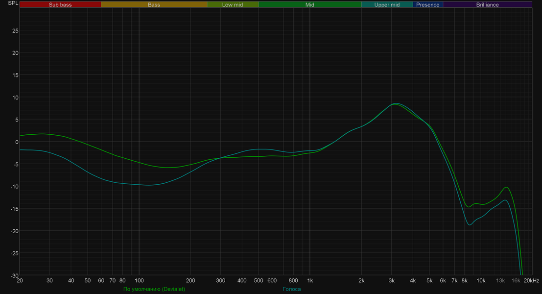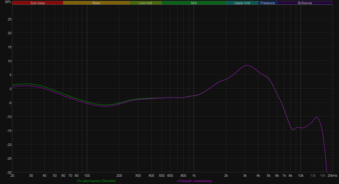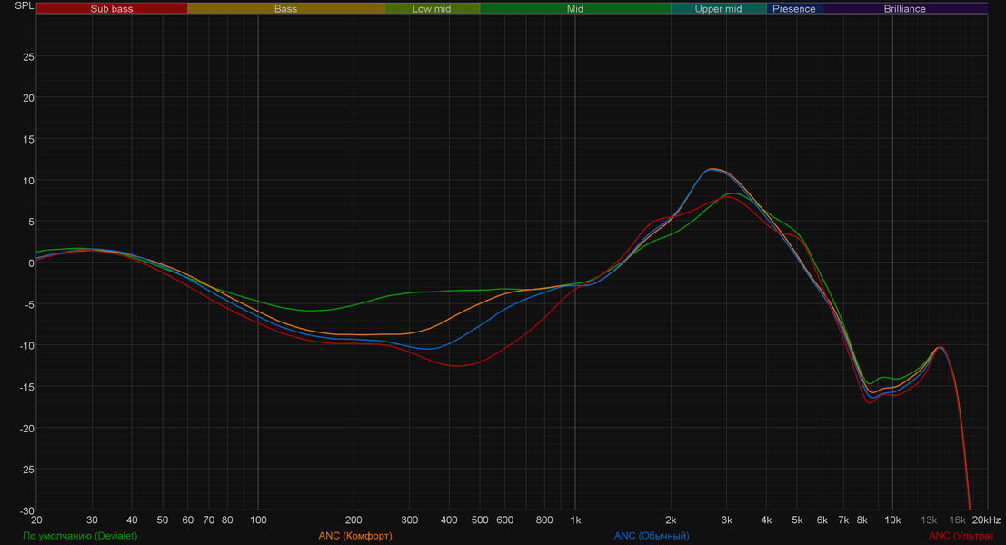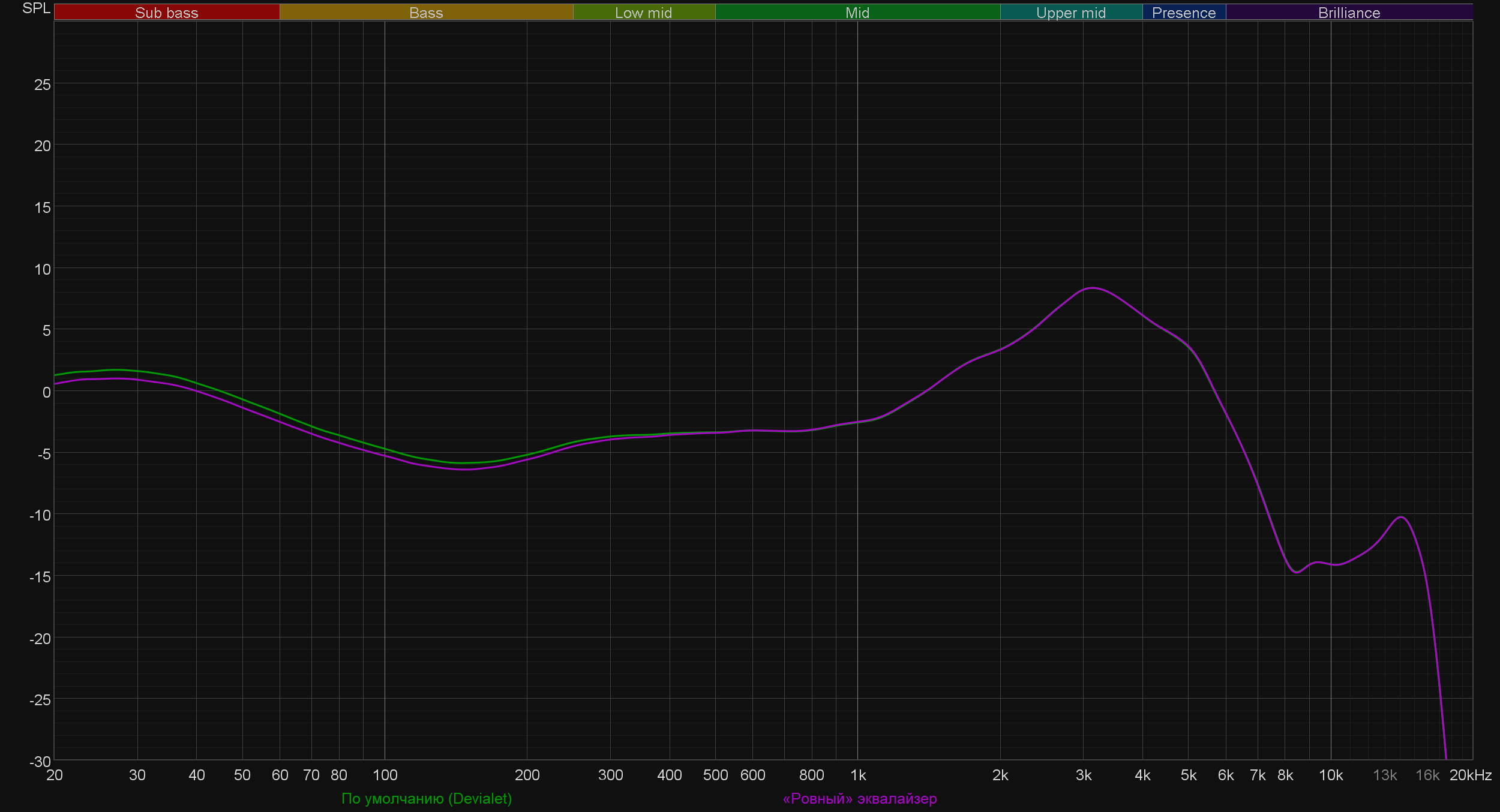 Потому не будем увлекаться критикой и посмотрим, как работают встроенные пресеты эквалайзера. Для получения последнего графика мы создали профиль, где все регуляторы стоят в нейтральном значении. Сделано это чтобы убедиться, что активация профиля Devialet не меняет звук коренным образом. Так и получилось — именно в этом случае наушники играют так, как было задумано разработчиками.