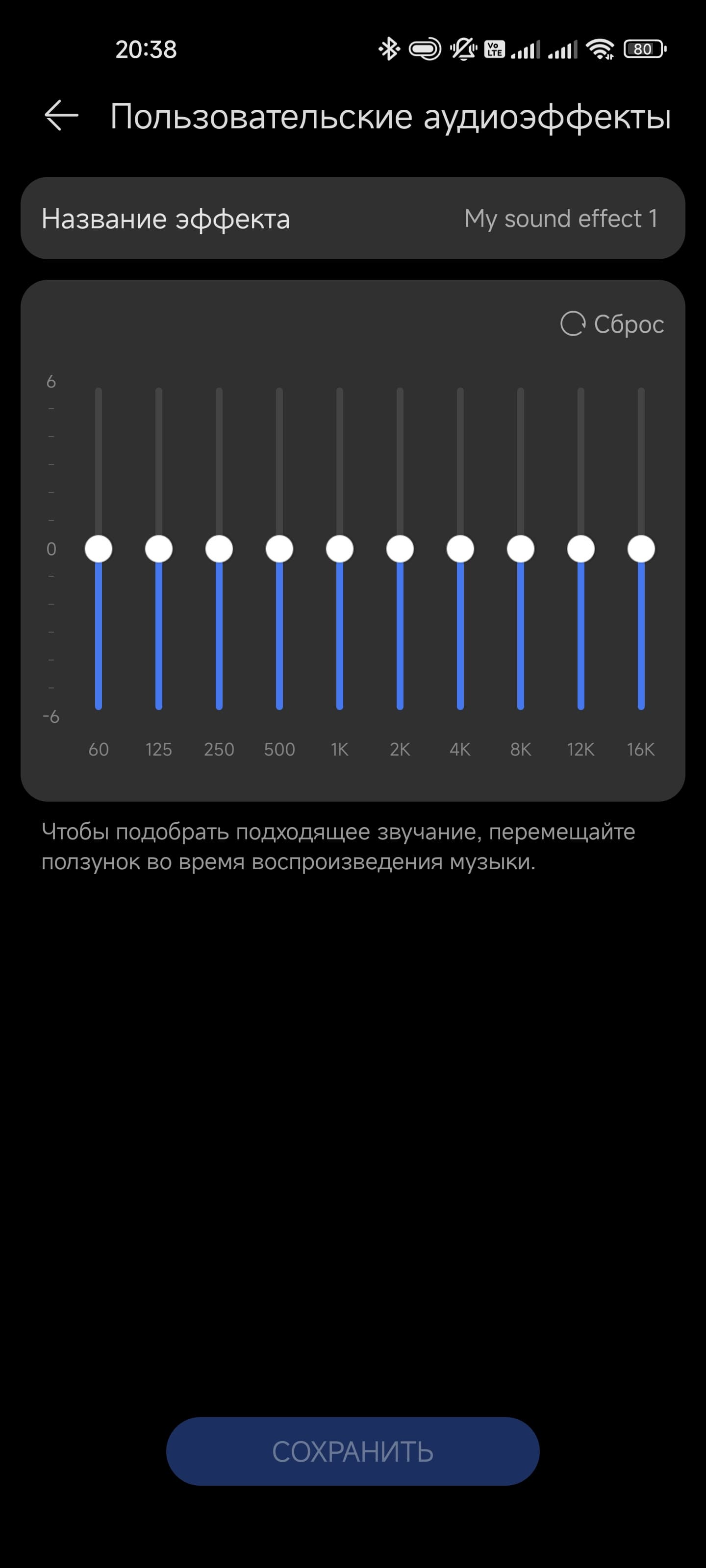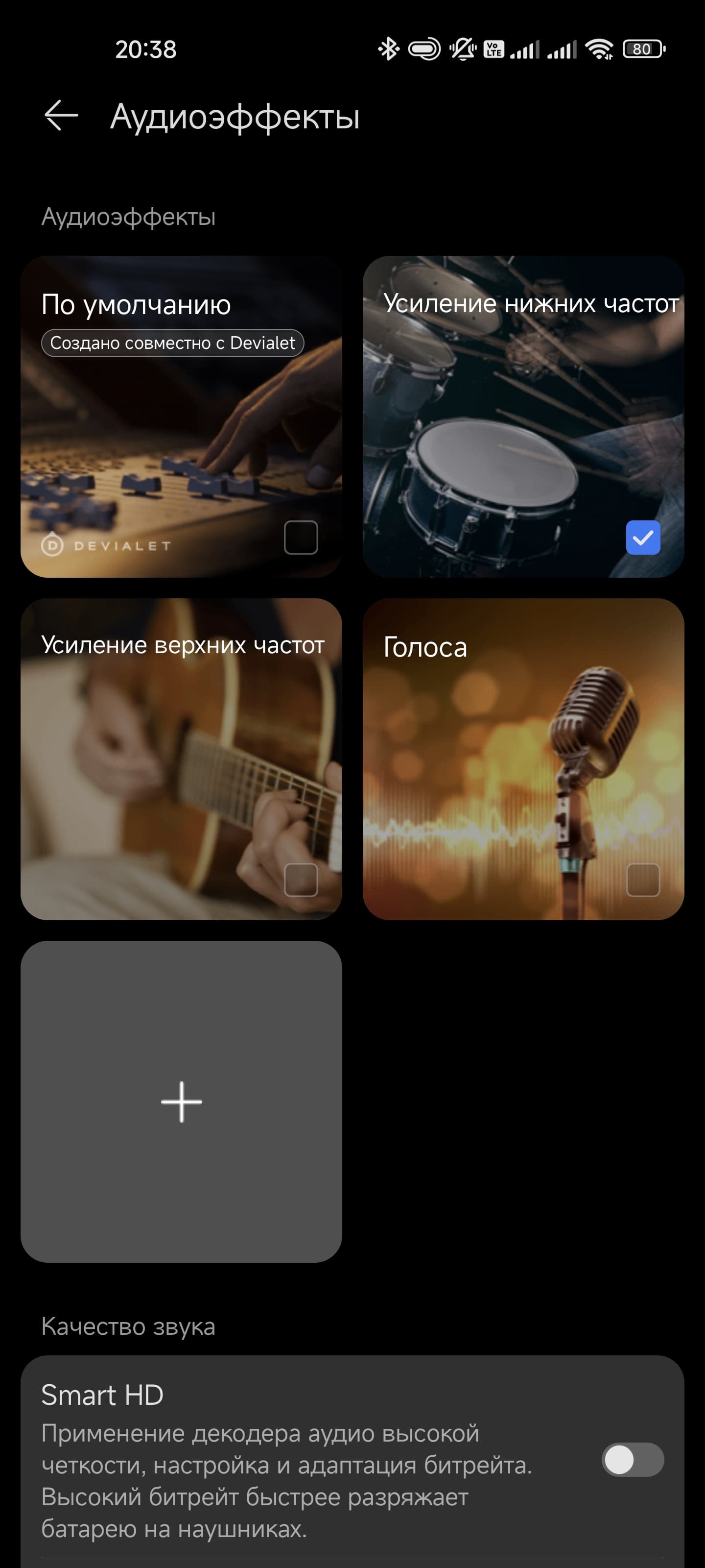 Настройка звучания вновь проводилась при участии французского производителя аудиотехники Devialet. На примере колонки Huawei Sound Joy мы уже знаем, что получается у них крайне неплохо. В приложении появился долгожданный эквалайзер с несколькими встроенными пресетами и возможностью создавать свои. При этом заявлена система динамической оптимизации звучания, призванная сделать прослушивание музыки еще более приятным и захватывающим.