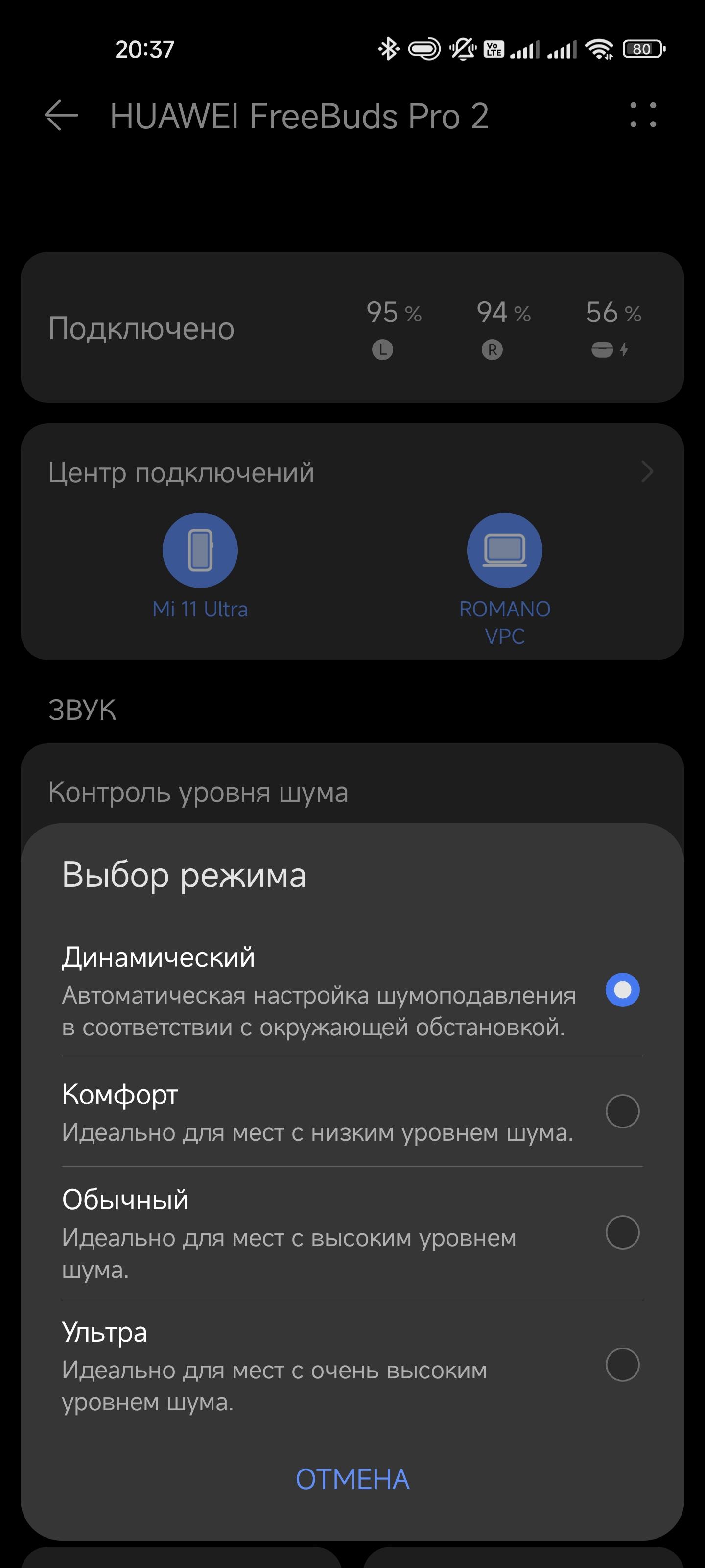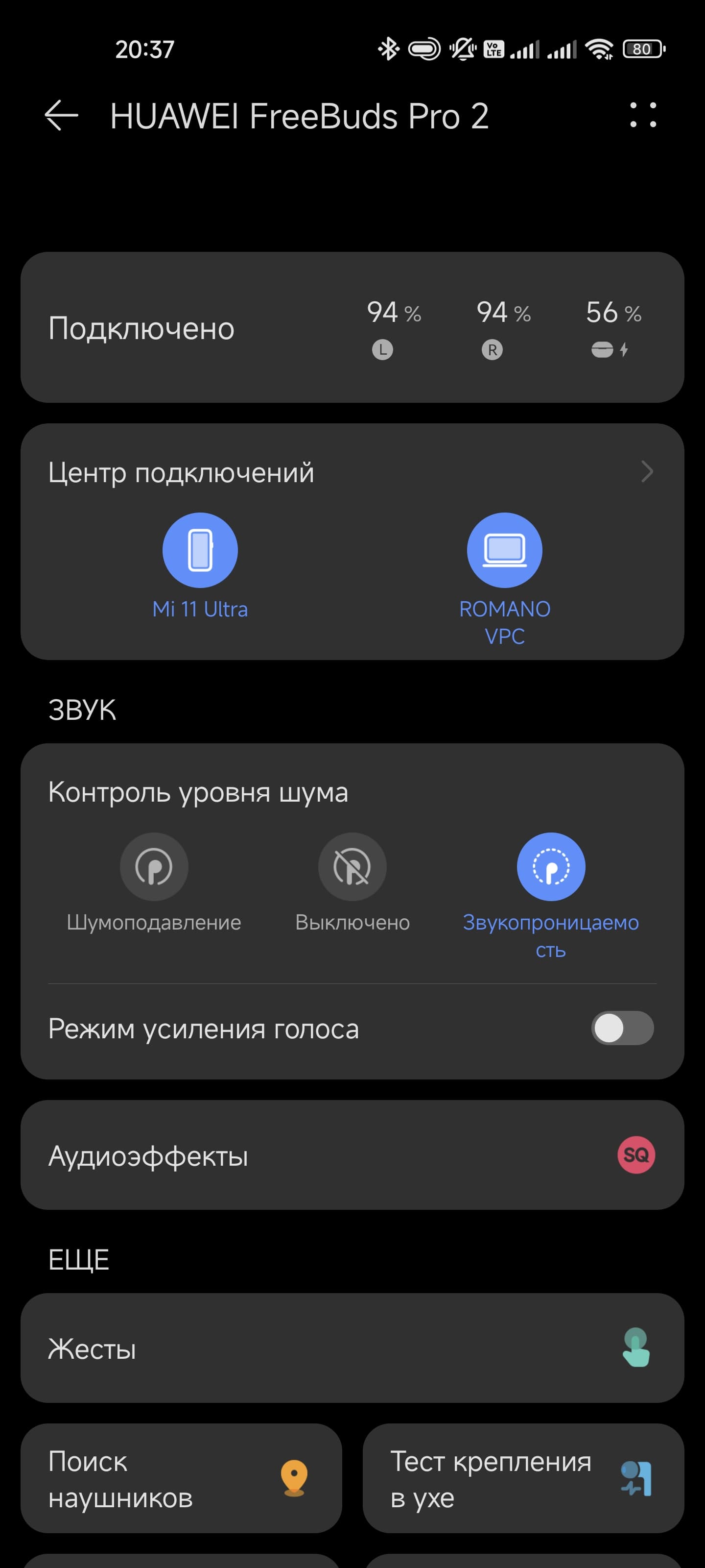 Уровень пассивной звукоизоляции хороший — в целом, наушники можно комфортно использовать и без задействования активного «шумодава». Но с ним, конечно, бывает намного удобнее. Производитель анонсирует повышение эффективности его работы, причем довольно-таки значительное. Мы, признаться, особой разницы не заметили: у первых FreeBuds Pro все было отлично, у вторых — тоже замечательно, на уровне лучших из протестированных нами гарнитур. При этом поддерживаются три режима работы: