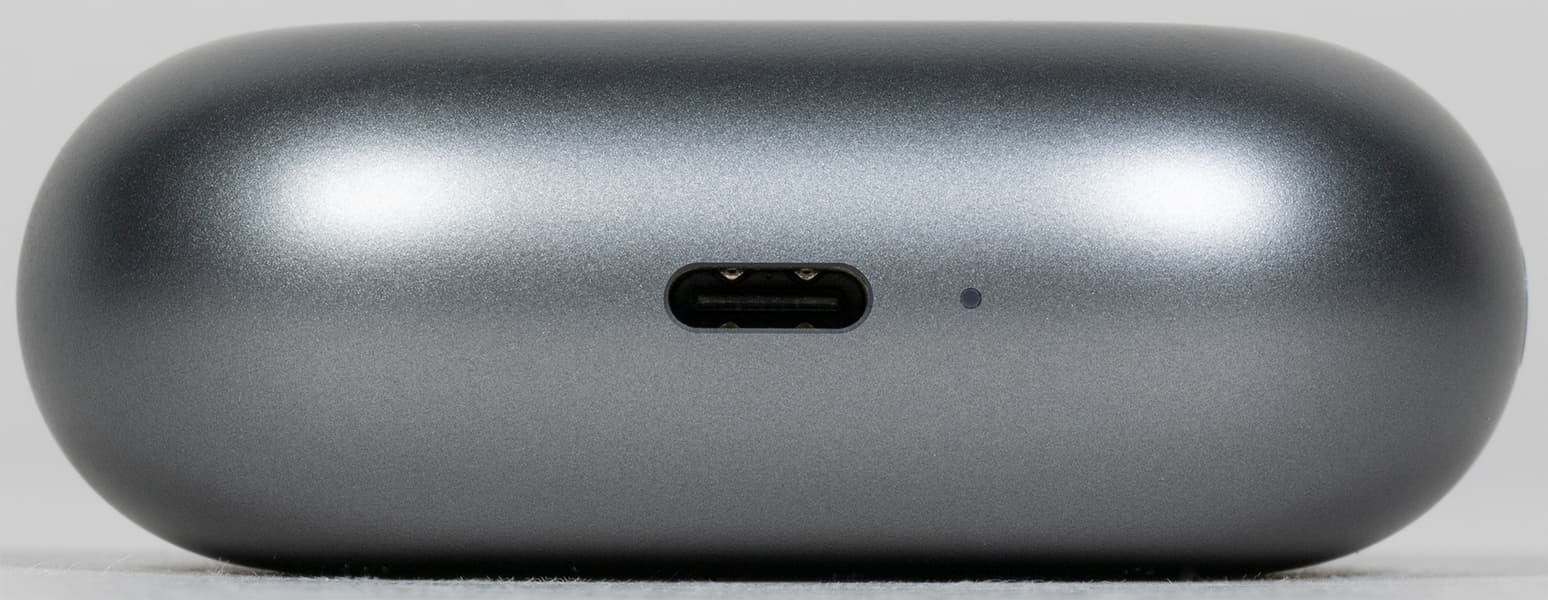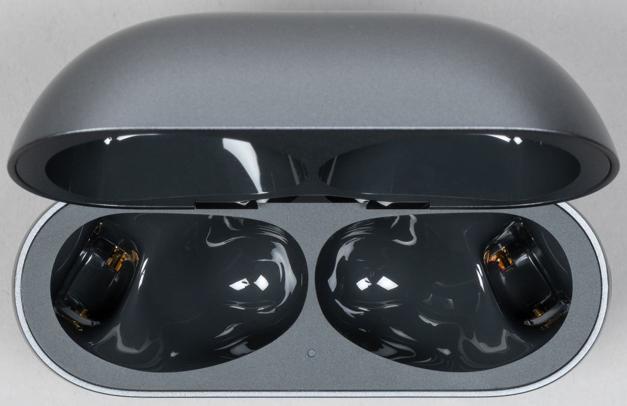 В слотах для наушников видны подпружиненные контакты для зарядки. По центру размещен небольшой индикатор состояния, благодаря которому можно узнать об активации сопряжения, например.