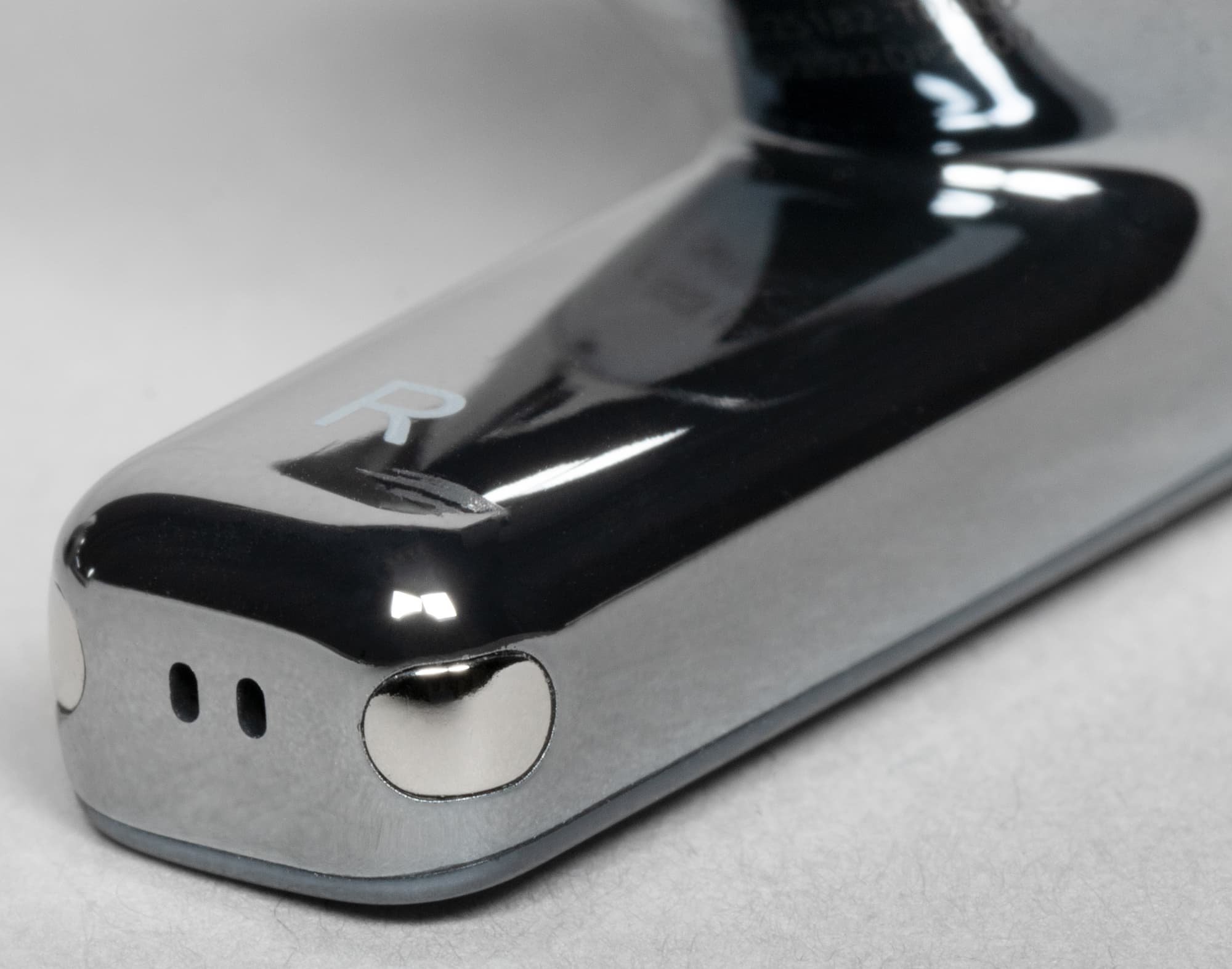 На торцевой части ножек видна пара контактов для зарядки. Между ними расположены отверстия микрофонов, использующихся для голосовой связи. В первой версии гарнитуры они были скрыты за специальными прорезями, призванными снизить влияние шума ветра на передаваемый сигнал. Сейчас от них решено было отказаться. Сразу отметим, что качество передачи голоса от этого не снизилось.