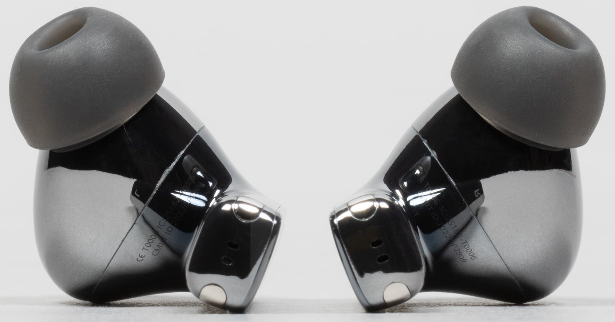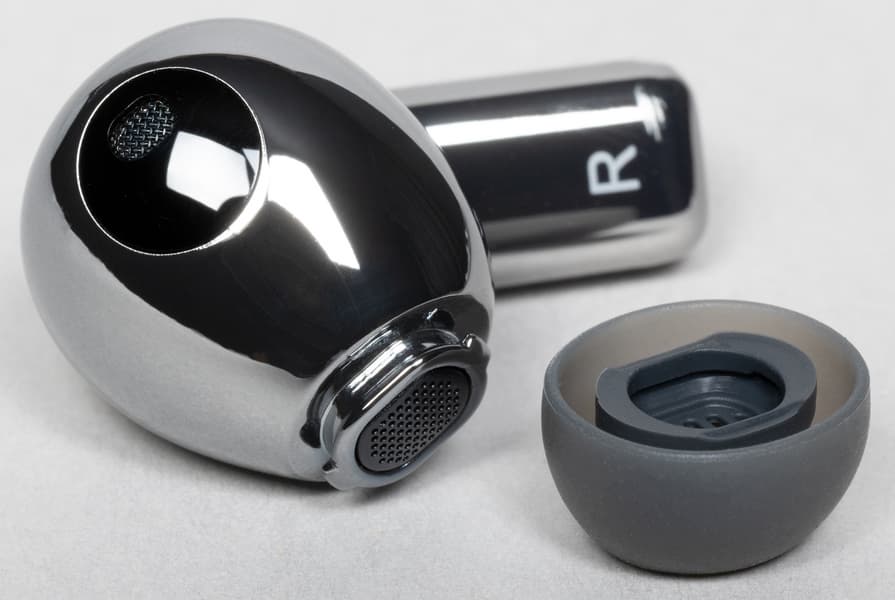 Выход звуковода FreeBuds Pro 2 вновь овальный, а вот размеры его сократились. В прошлой версии они составляли 8,3 мм по длинной оси и 7 мм по короткой. В рассматриваемой — 6 и 5,6 мм. Амбушюры имеют соответствующую форму и оснащены внутренней силиконовой сеточкой, защищающей основную сетку звуковода от попадания на нее загрязнений. Крепление нестандартное, потому подобрать замену комплектным насадкам будет сложновато.