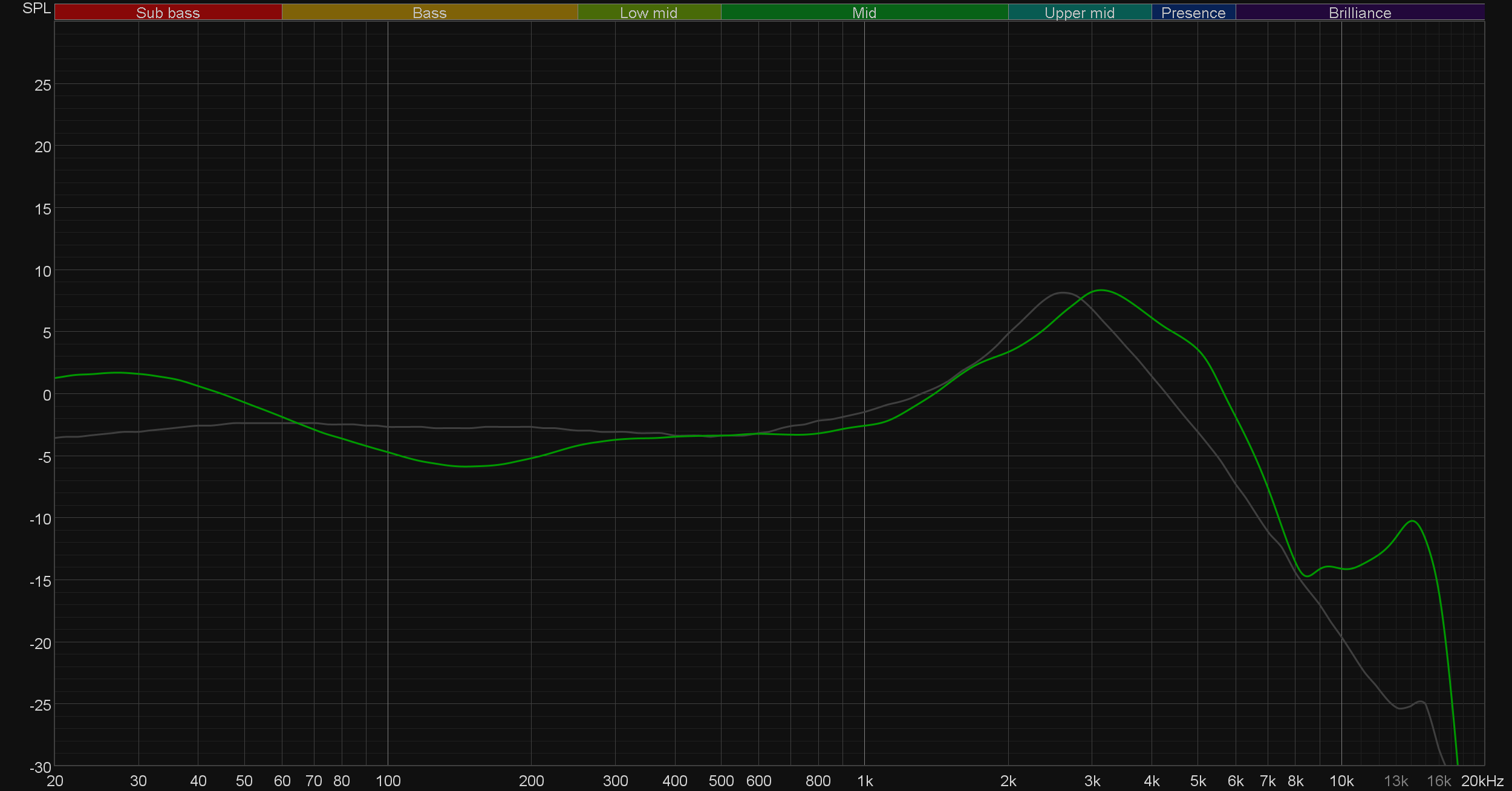 График АЧХ показан на фоне кривой IDF (IEM diffuse field compensation), предоставленной производителем используемого стенда. Ее задача — помочь скомпенсировать резонансные явления в имитированном слуховом канале и особенности используемого оборудования, создав «звуковой профиль», максимально корректно иллюстрирующий то, как звучание наушников воспринимается слушателем. Ее можно рассматривать как адаптированный под конкретное устройство аналог так называемой «кривой Хармана», созданной командой Harman International под руководством доктора Шона Олива. Скомпенсируем полученный график АЧХ в соответствии с кривой IDF.