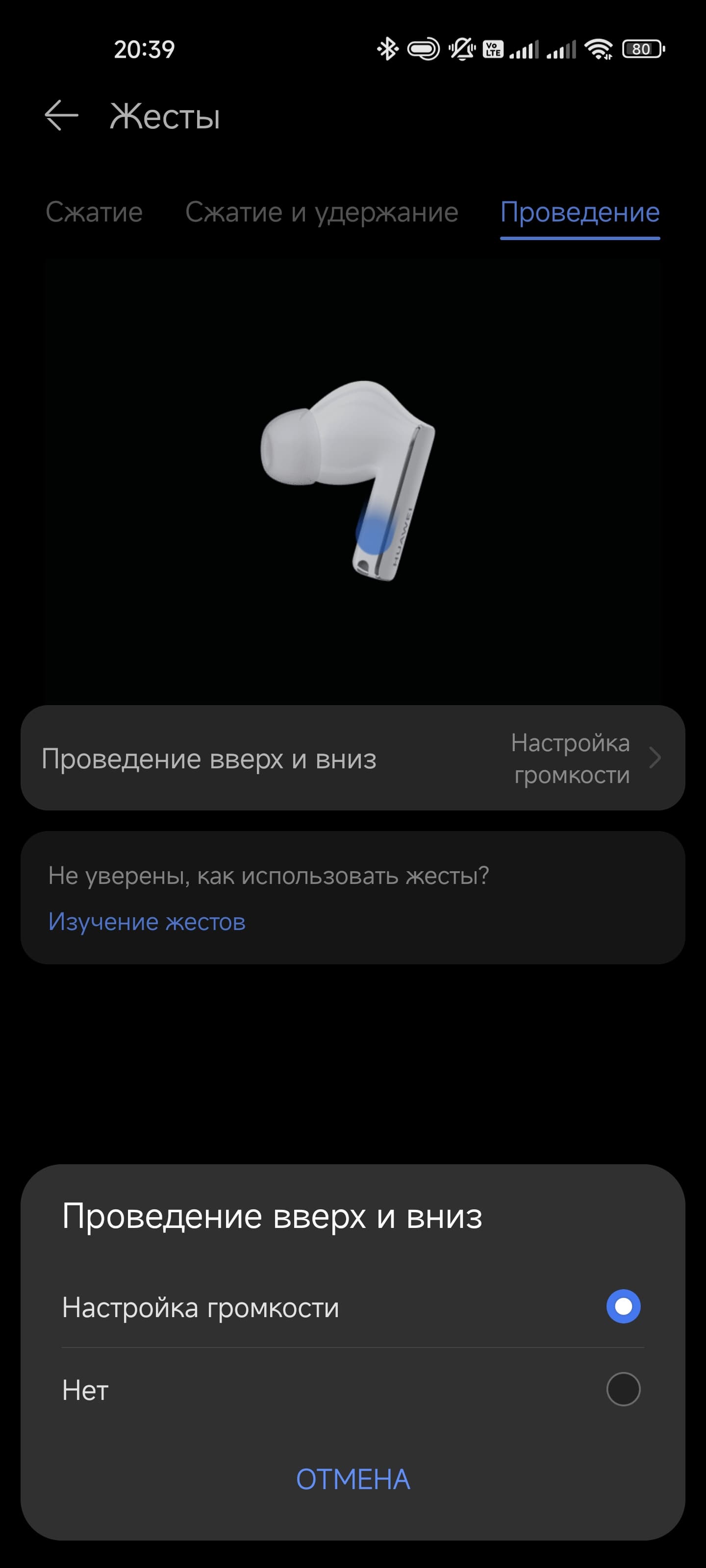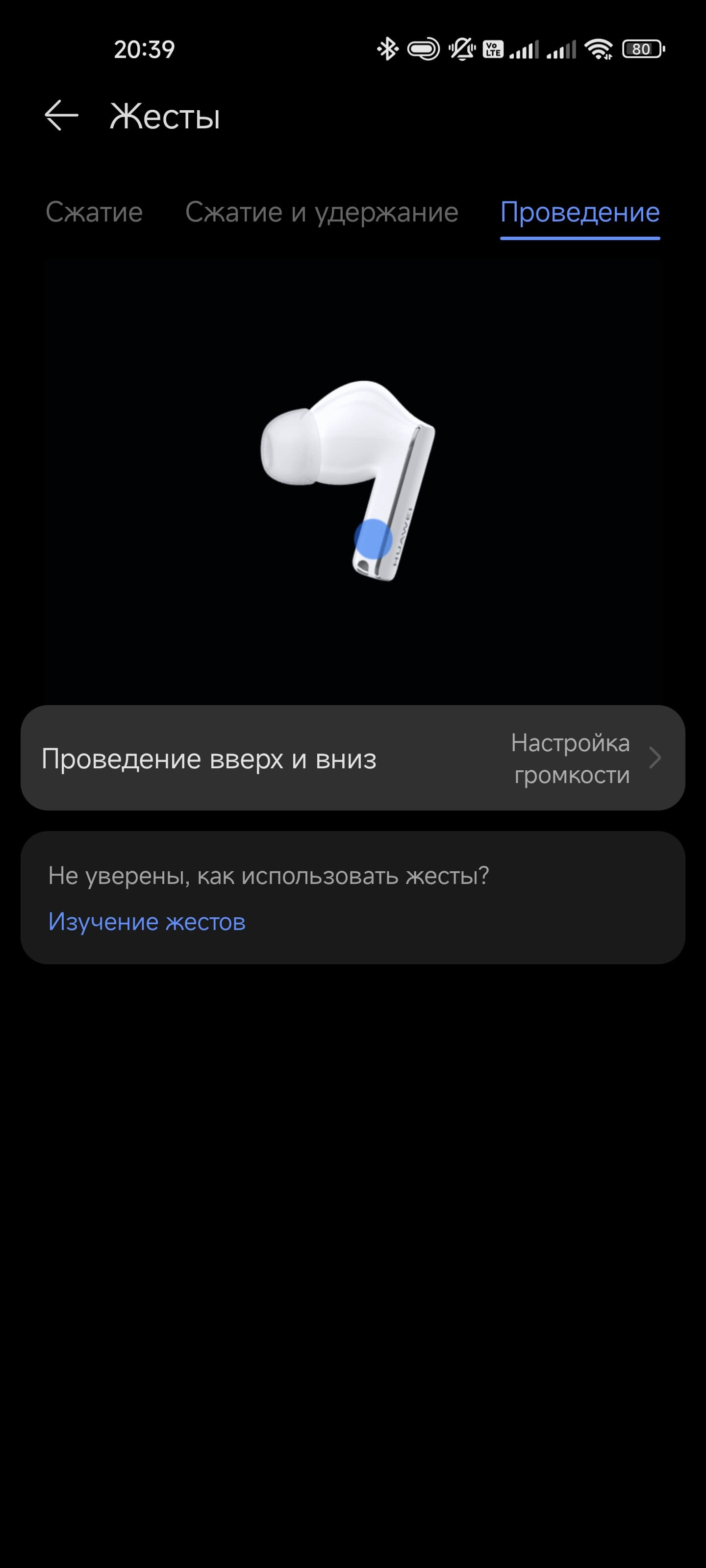 Отдельно следует отметить возможность изменения громкости свайпом по боковым поверхностям — удобно, если чуть привыкнуть. На самом деле, привыкнуть придется ко всей схеме управления в целом, особенно если раньше вы активно пользовались сенсорными панелями на внешней стороне какой-либо гарнитуры. Тут же придется сжимать ножку, положение наушника в ухе при этом неизбежно меняется… на первых порах это немного раздражает.
