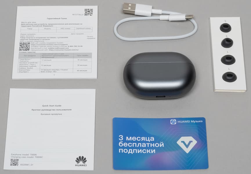 В комплект поставки входят сами наушники в кейсе, три пары силиконовых насадок (одна установлена по умолчанию), кабель USB-A—USB-C длиной 20 см для зарядки, краткое руководство и гарантийный талон. Плюс три месяца подписки на стриминговый сервис «Huawei Музыка».