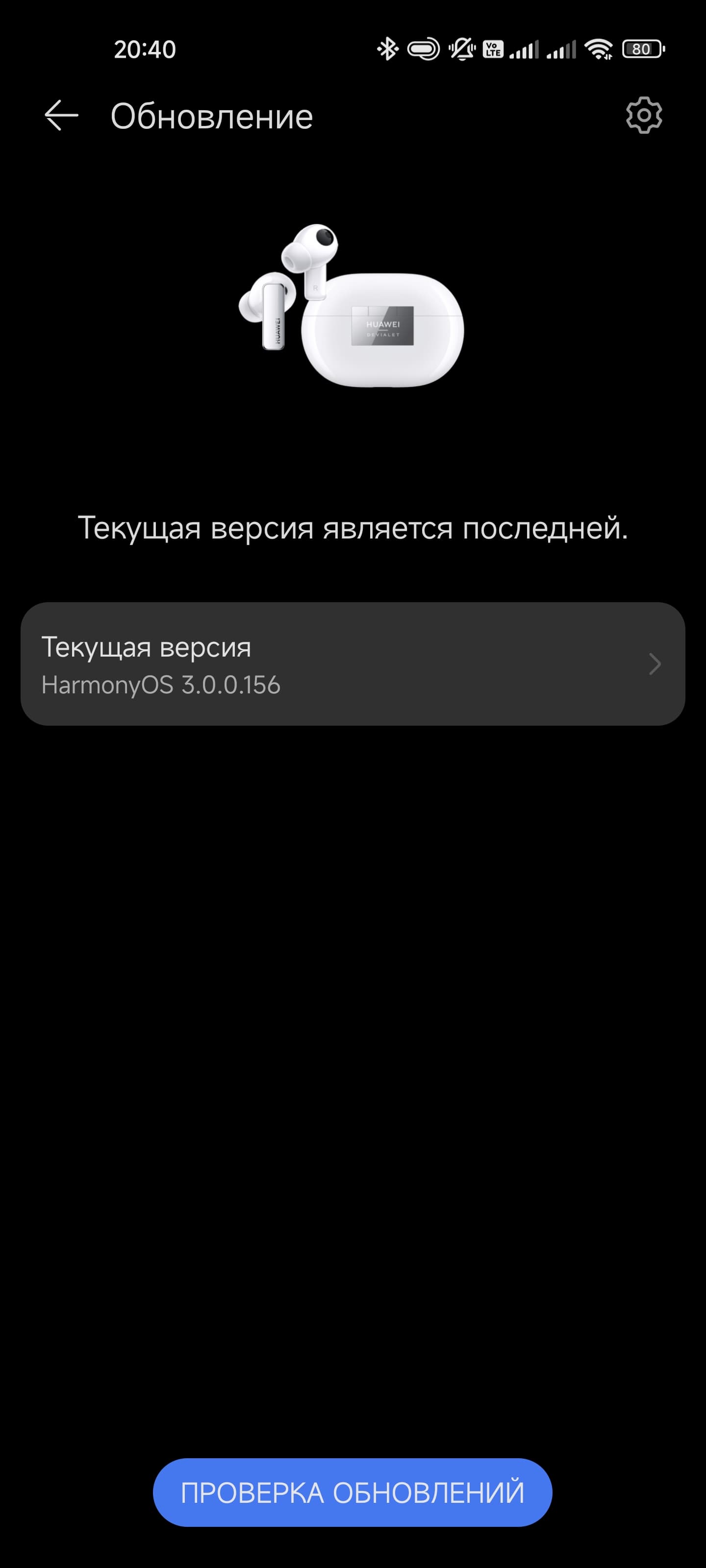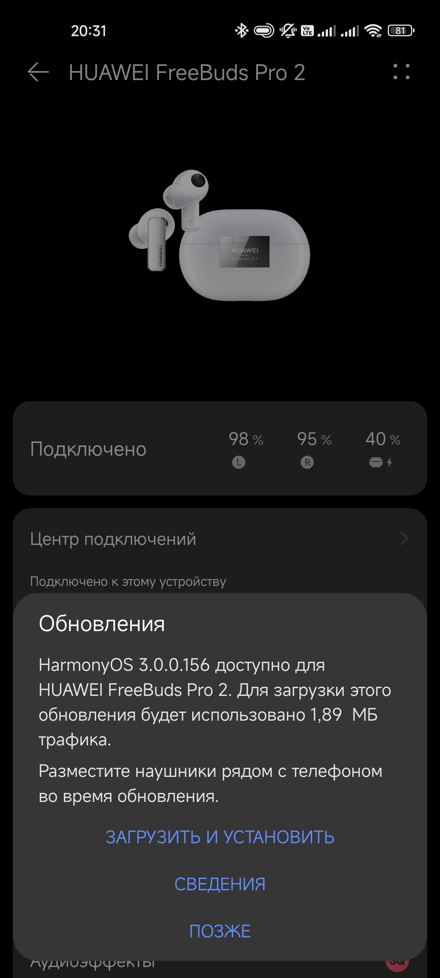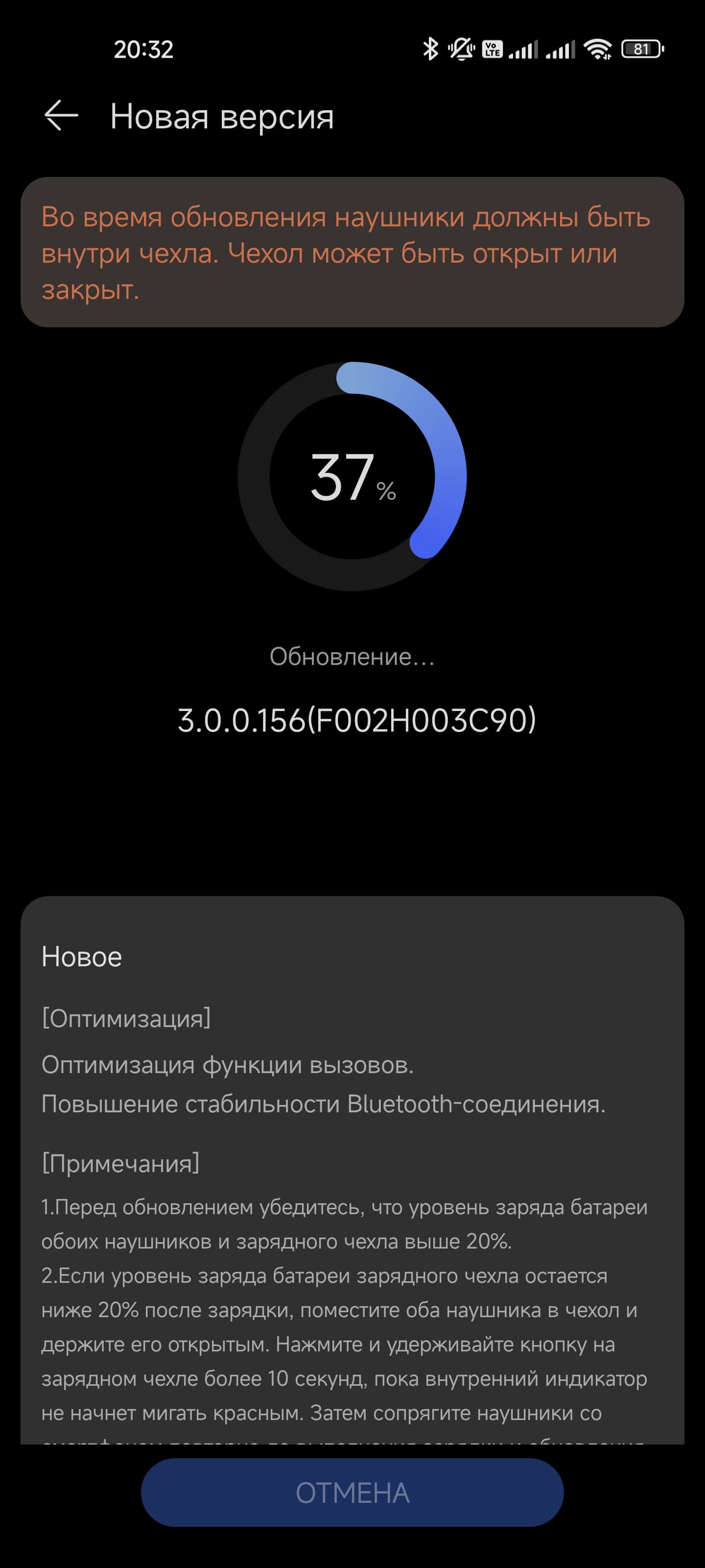 После этого мы оказываемся на главной странице устройства, где сразу получаем предложение обновить его прошивку до свежей версии — соглашаемся. Процесс занял у нас порядка пяти минут, после чего мы вновь вернулись на страницу управления Huawei FreeBuds Pro 2, где можно увидеть уровень зарядки каждого из наушников отдельно, а также кейса.