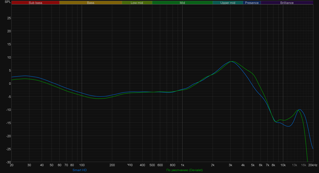 Сразу проверим, как влияет на профиль звучания активация режима Smart HD. Видим, что пусть и влияет, но особенно сильно — ключевые моменты остаются неизменными.