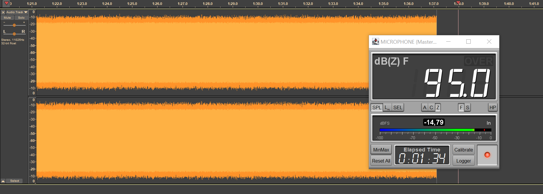 Вкратце напомним нашу методику тестирования автономности беспроводных наушников. Безопасным уровнем звукового давления при прослушивании музыки считается 75 дБ, но на практике большинство слушателей предпочитает уровень 90-100 дБ. Мы транслируем в наушники белый шум, фиксируя уровень SPL в районе 95 дБ, сразу после старта воспроизведения запускаем запись сигнала с измерительного стенда — по длине получившегося трека легко понять, сколько проработал каждый из наушников.