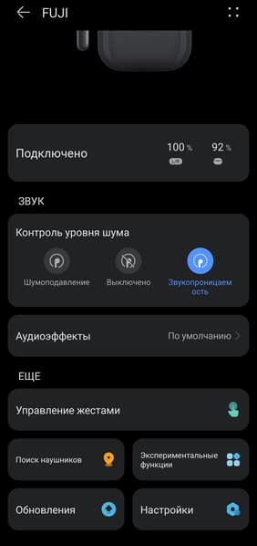 В разделе «Экспериментальные функции» обнаружилась возможность включить управления громкостью пятикратным касанием сенсорной зоны — в удачности этого эксперимента есть большие сомнения, это тот случай, когда достать телефон из кармана оказывается проще. Но, возможно, кому-то и будет удобно. В разделе с прочими настройками приложение позволяет принудительно проверить наличие обновлений прошивки, включить режим снижения задержки звука и почитать довольно объемный и информативный раздел с ответами на часто задаваемые вопросы.