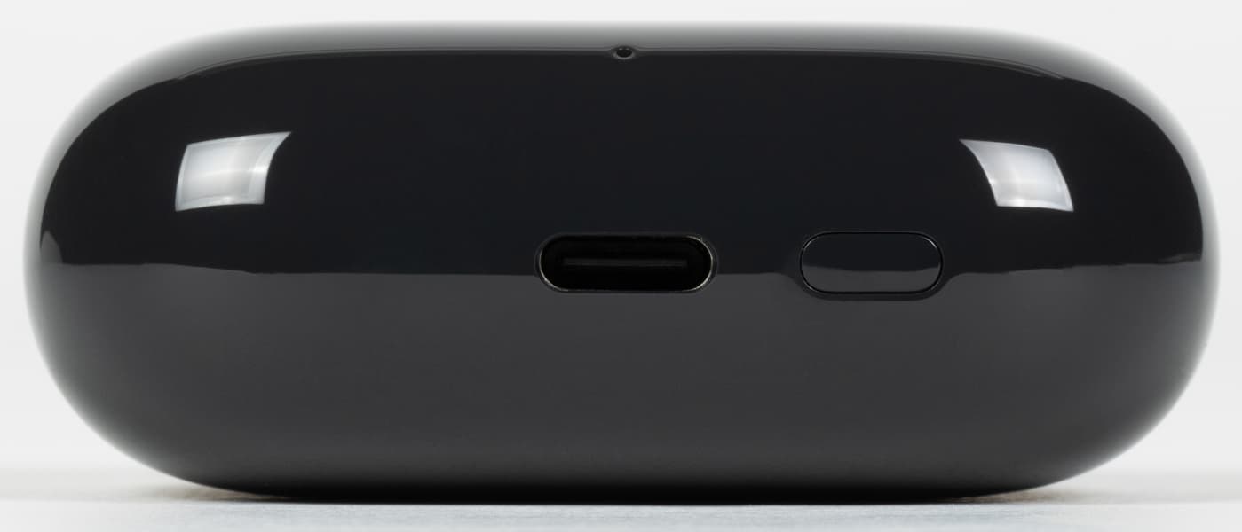 На дне футляра находится порт USB Type C для зарядки, также кнопка активации Bluetooth-сопряжения. Размещена она заподлицо с корпусом, нажимается довольно легко, но все же с усилием чуть выше среднего — случайное срабатывание практически исключено. С практической точки зрения особого смысла в отдельной кнопке без поддержки мультипойнта нет — ее наличие скорее формальность.