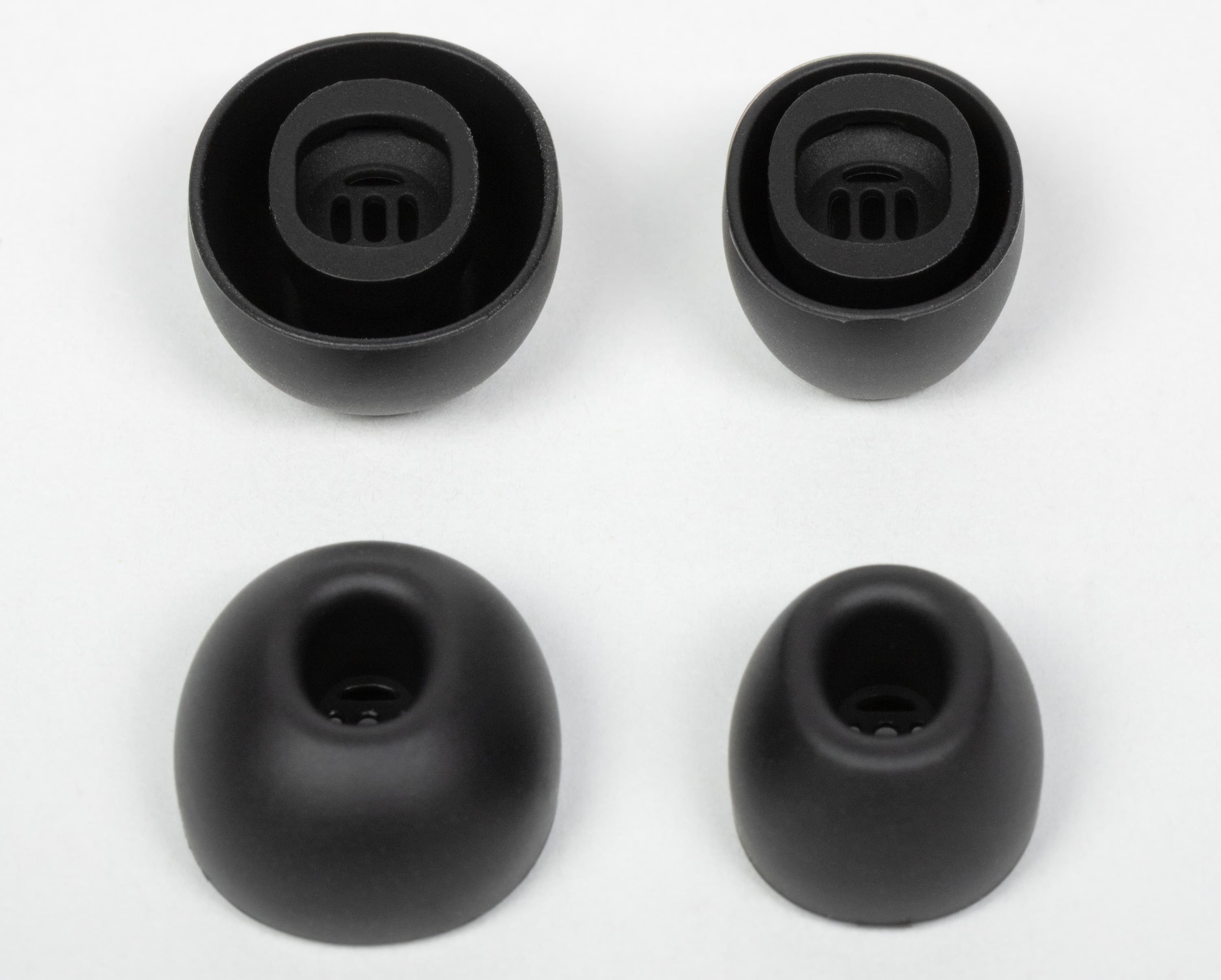Силиконовые насадки фиксируются на концах звуководов с помощью крупных выступов. Снимаются они довольно легко, но в ухе при извлечении наушников не остаются и самопроизвольно не слетают — с этим все отлично.