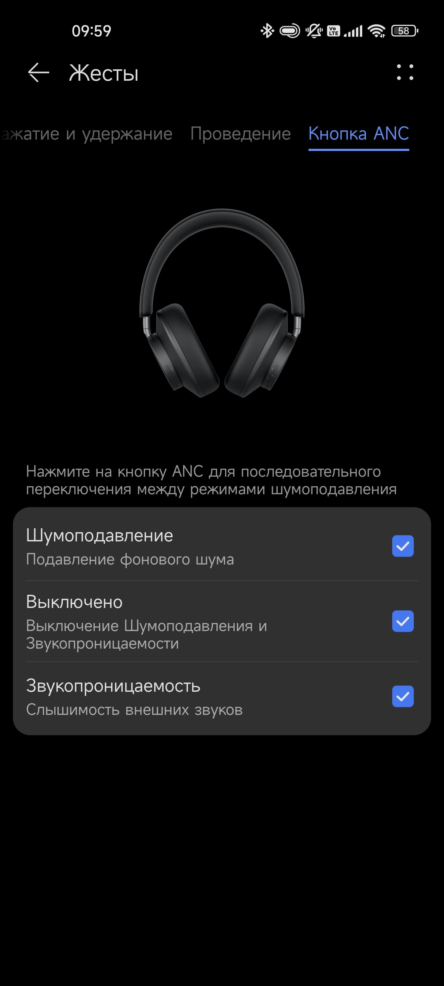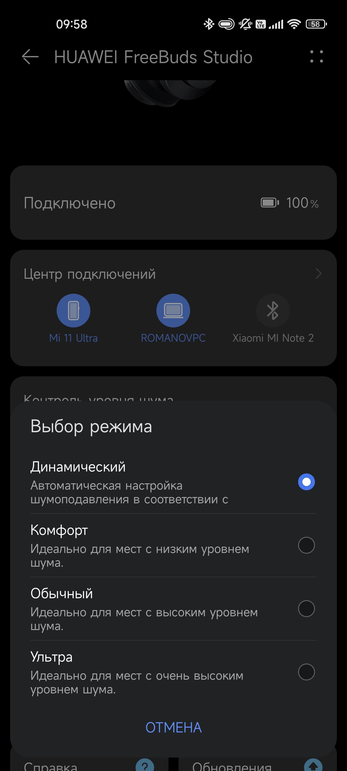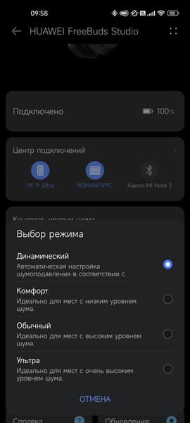 Ну а мы возвращаемся в приложение. Еще одна из самых интересных особенностей FreeBuds Studio — это, конечно, система активного шумоподавления, имеющая три режима работы: «комфорт», «обычный» и «ультра», которые можно включить в приложении. По умолчанию выбрана опция динамического переключения — наушники анализируют уровень шума и сами решают, какой из вариантов работы «шумодава» актуален.