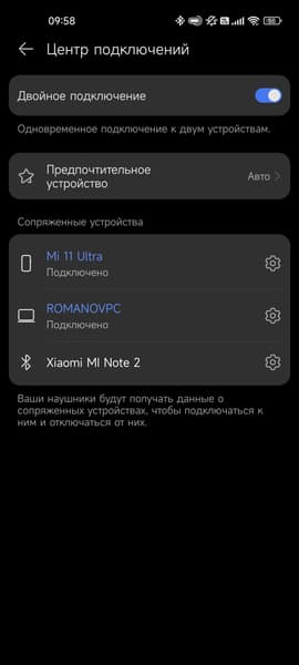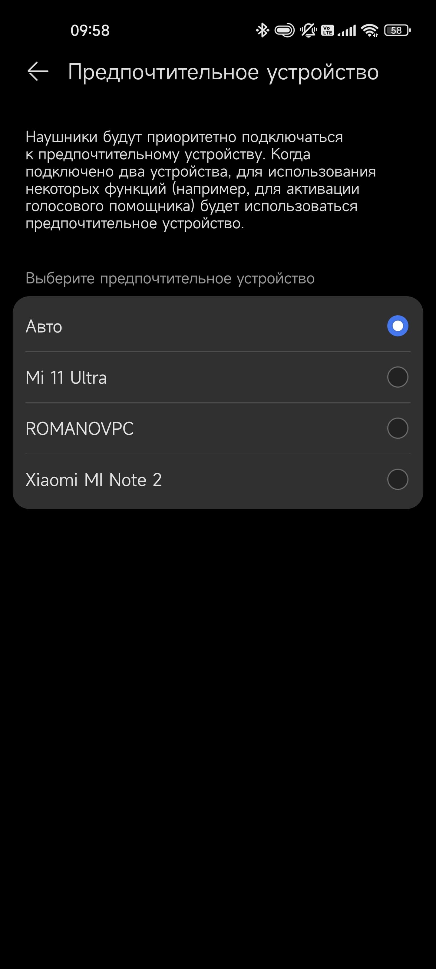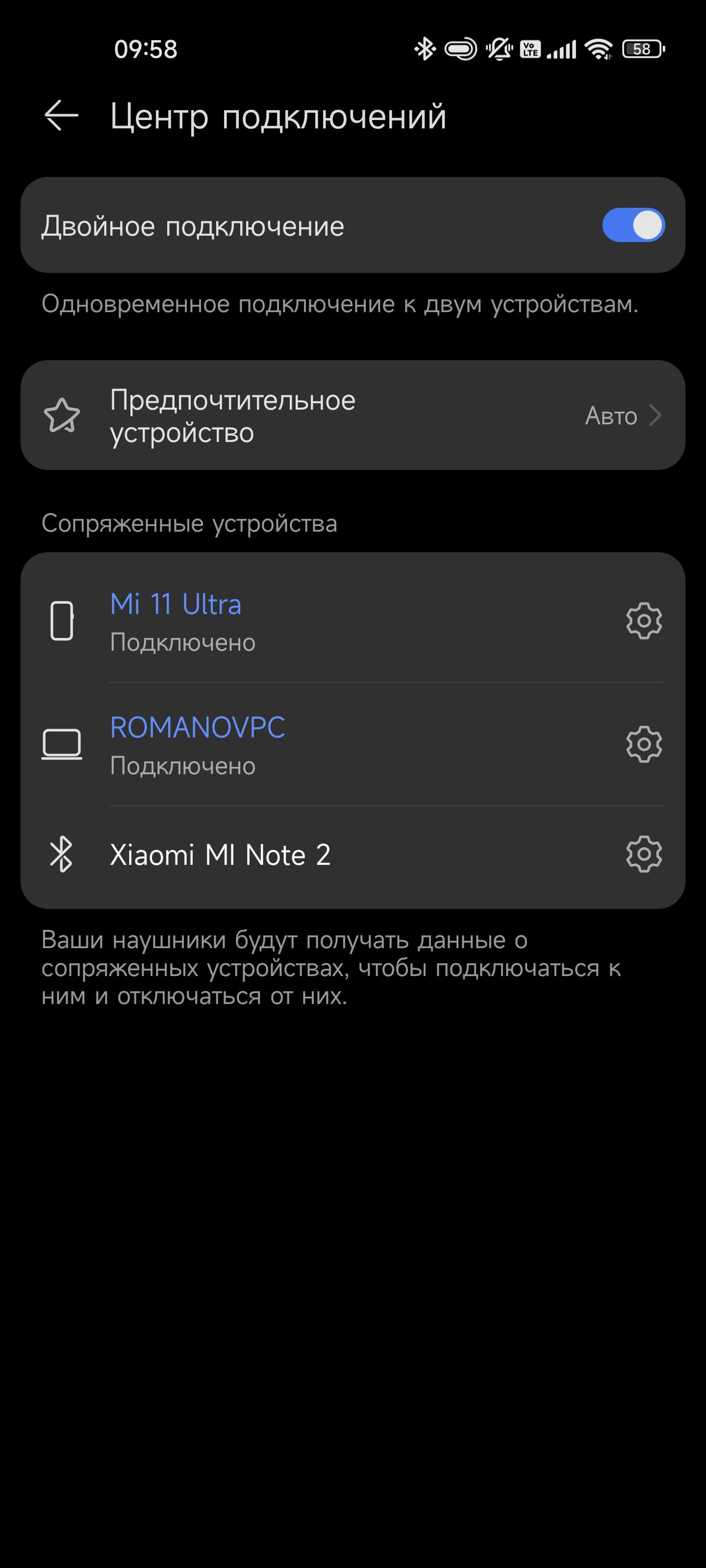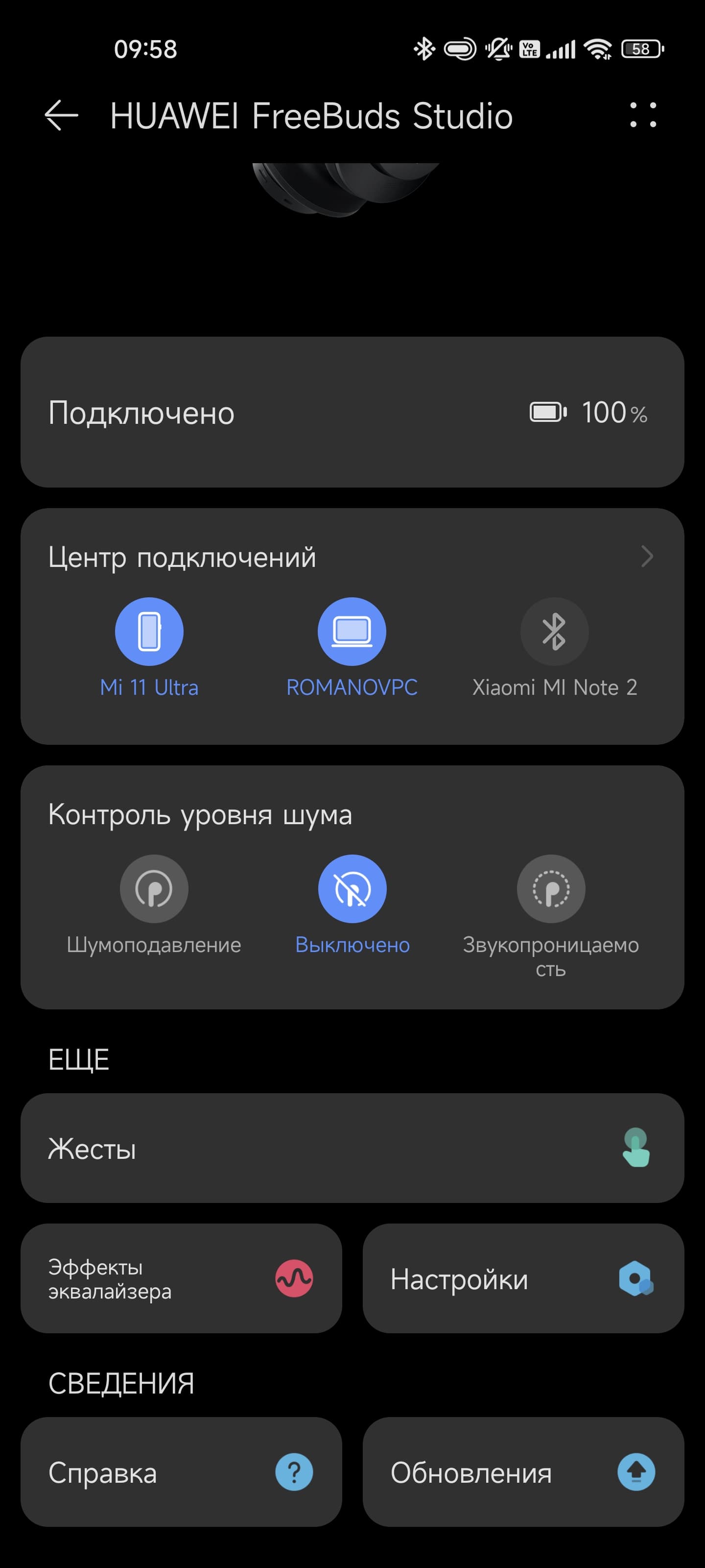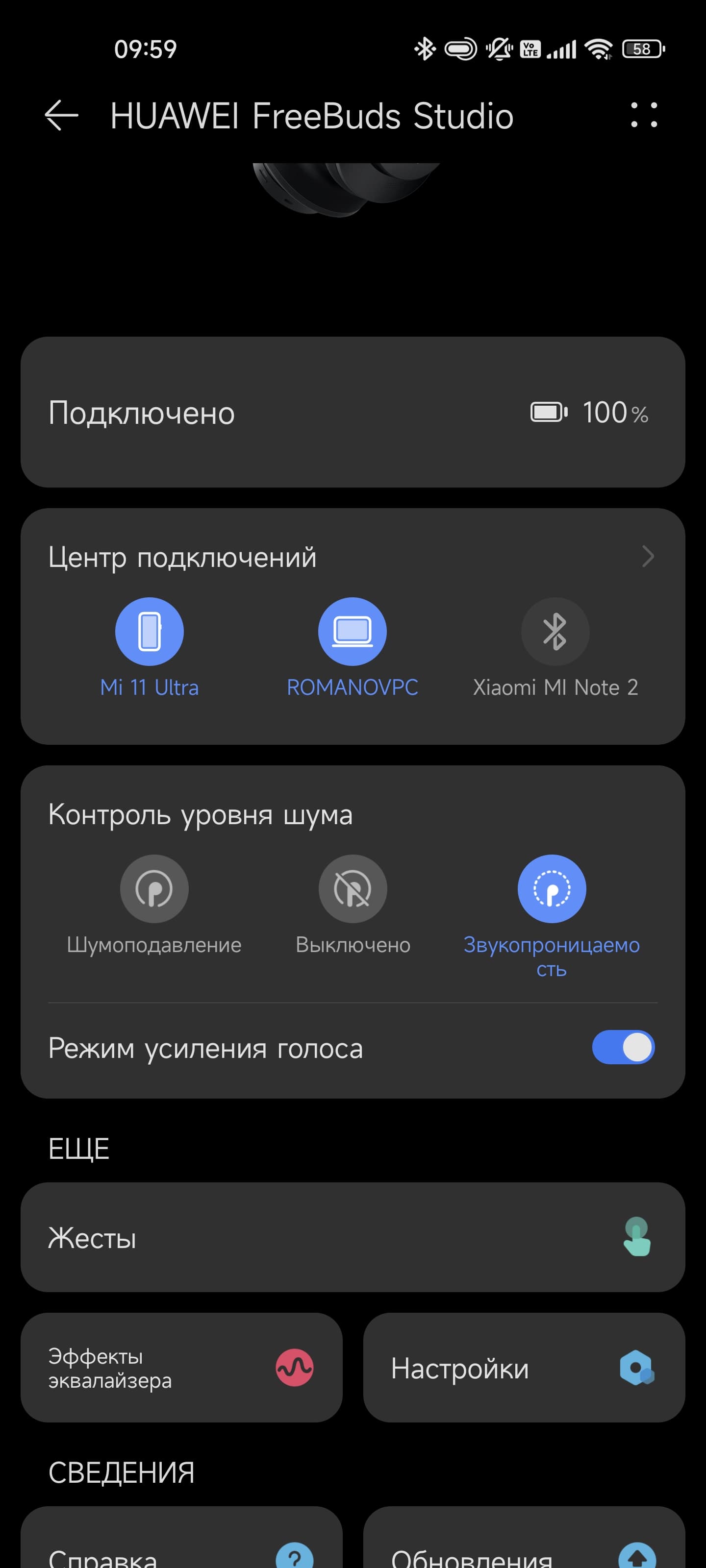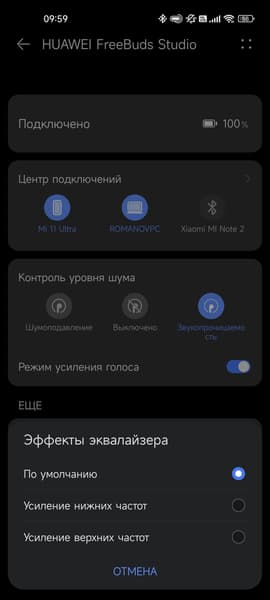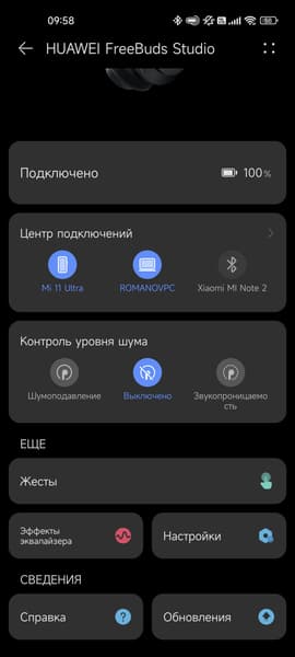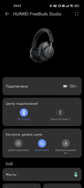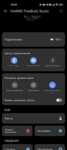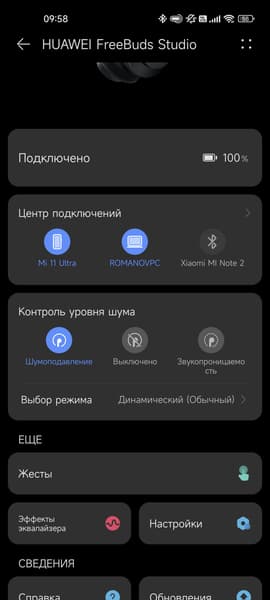 Одна из ключевых особенностей FreeBuds Studio — это настраиваемый режим работы с несколькими устройствами. Нам без проблем удалось добавить три, можно и больше, но одновременная работа поддерживается только с двумя, предпочитаемый источник можно выбрать в специальном меню. Все реализовано очень удобно, фокус перемещается между устройствами корректно и быстро.