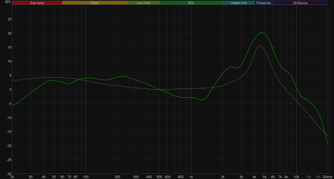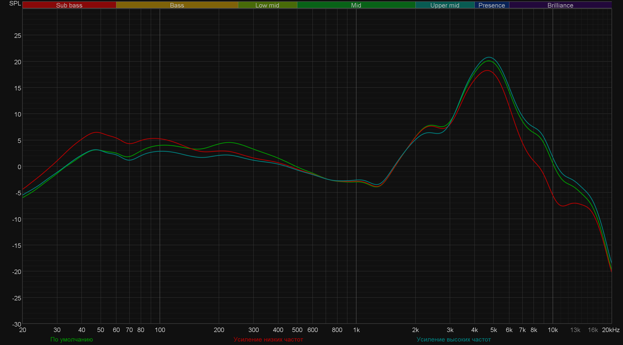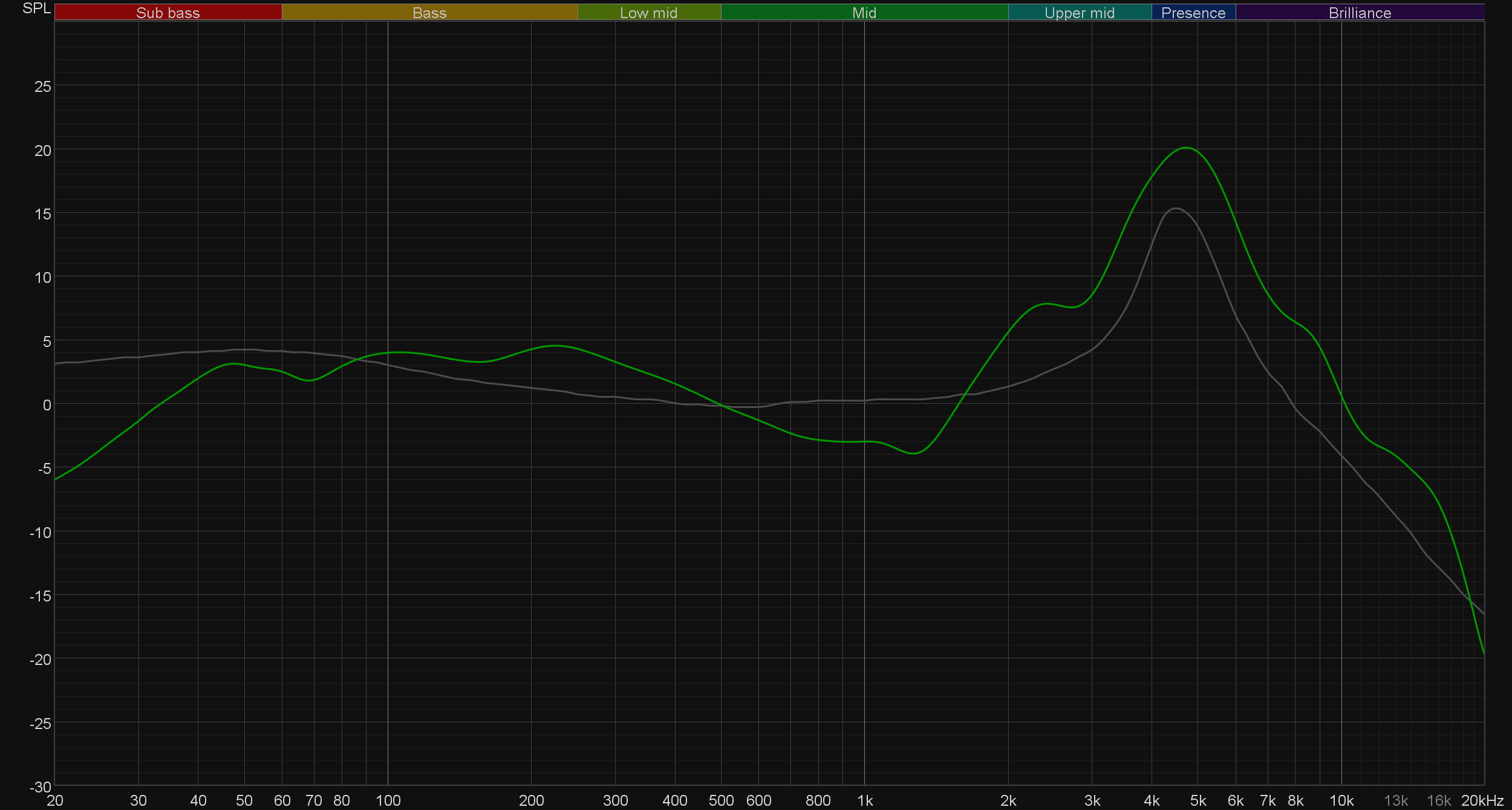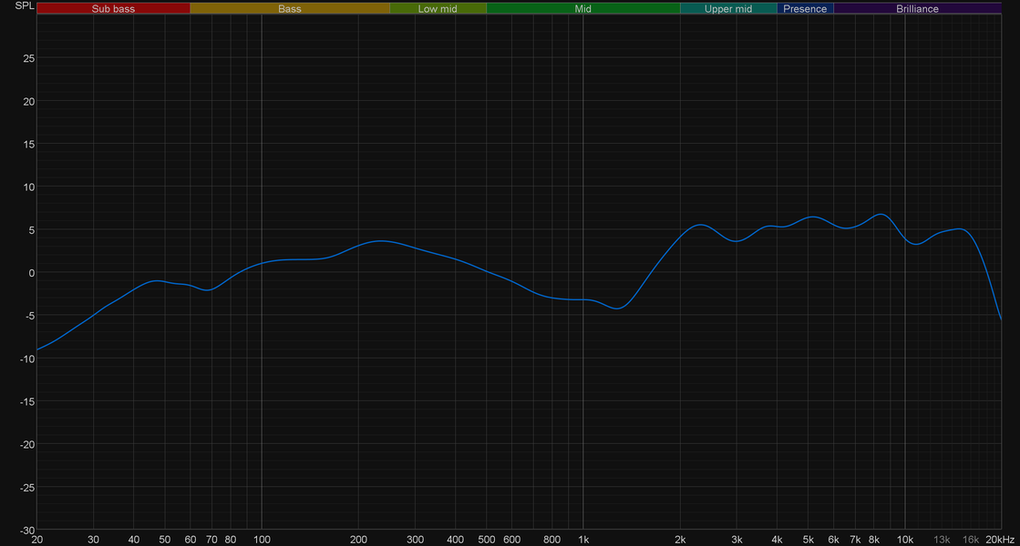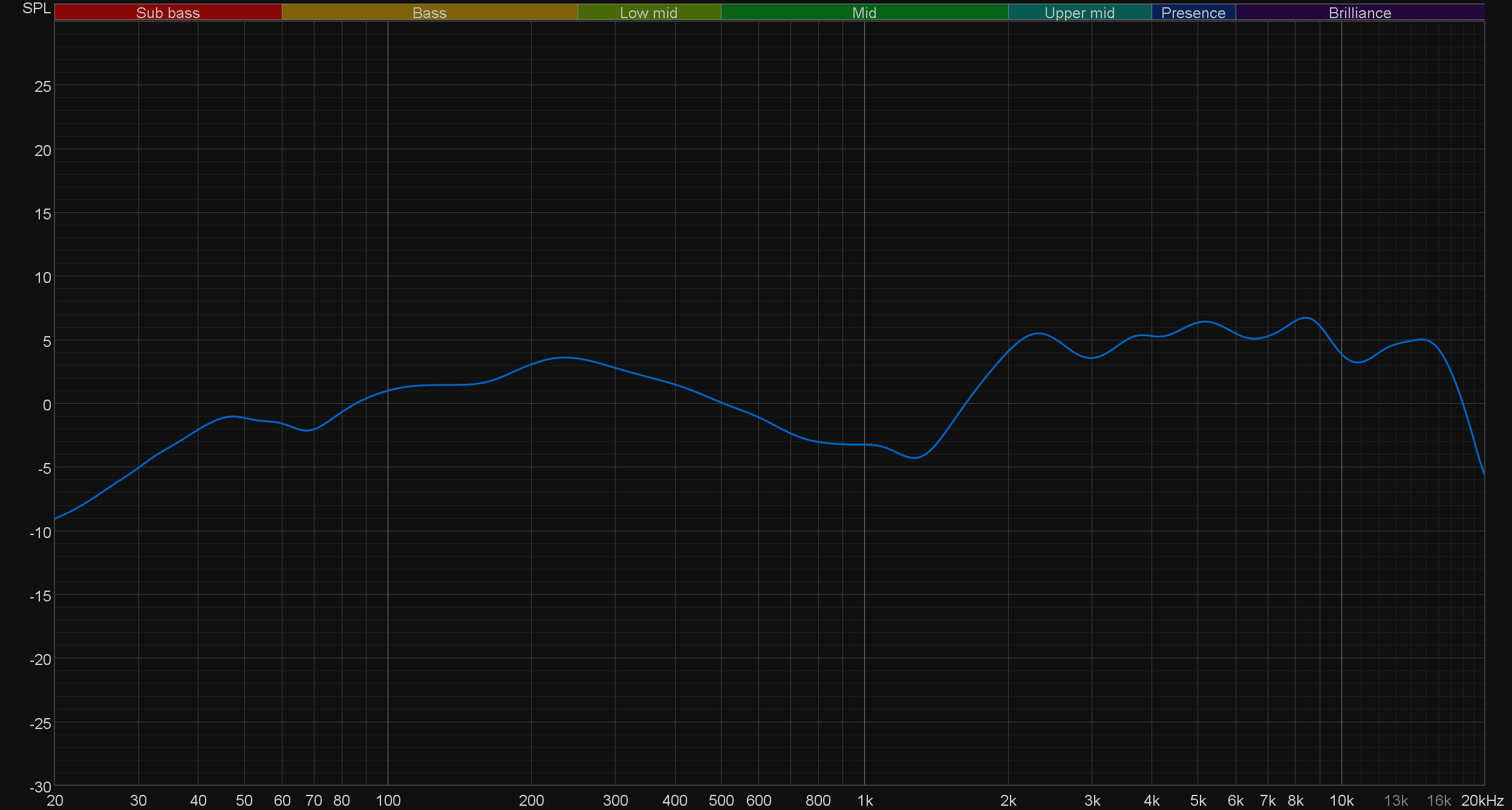 График АЧХ показан на фоне целевой кривой, предоставленной производителем используемого стенда. Она является адаптированным под конкретное устройство аналогом так называемой «кривой Хармана», созданной командой Harman International под руководством доктора Шона Олива. Люди неодинаково воспринимают звук разной частоты, поэтому даже самые точные измерения могут не соответствовать реальному пользовательскому опыту. Для компенсации этих различий и используется целевая АЧХ. Близкое к ней звучание оценивалось сотнями участников экспериментов как нейтральное, сбалансированное, естественное и так далее.